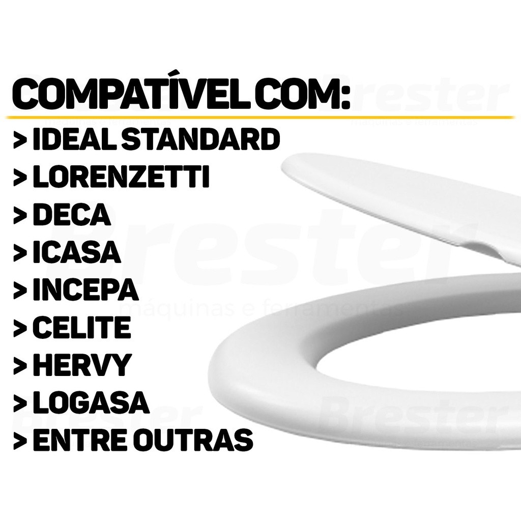 Olá, Bem vindo a Distribuidora Bem estar atacadista Trabalhamos com uma grande variedade de ferramentas elétricas e manuais, descartáveis, eletroeletrônicos, artigos para casa, artigos de petshop e outros. Aqui você encontrará Produtos Originais, Nota Fiscal, Pronta Entrega e Envio Imediato! * Características do produto * Assento Sanitário Oval Universal Roma Alumasa O Assento Sanitário Convencional Oval Branco para vasos de louças é a escolha perfeita para seu banheiro, traz beleza e praticidade. Possui acabamento impecável e fica muito bonito no seu banheiro. Com design plano e acabamento fosco, alia resistência a praticidade em limpeza, por sua superfície lisa que dificulta o acumulo de impurezas. Compatível com: > DECA, ICASA, INCEPA, CELITE, HERVY, LOGASA, IDEAL STANDARD, LORENZETTI ENTRE OUTRAS. Detalhes Técnicos: > Material: Plástico Polipropileno, PVC > Altura do assento fechado: 4 cm > Largura do assento: 37,5 cm > Comprimento do assento: 43,6 cm > Fechamento: Convencional > Fixadores: Polipropileno (plástico) > Peso: 522g MODO DE INSTALAÇÃO: 1. Destaque os parafusos que se encontram junto com o conjunto de fixação. 2. Posicione os parafusos nos orifícios do Vaso Sanitário. Utiliza o encaixe dos parafusos no assento para frente ou para fora, para obter a cobertura ideal no vaso sanitário. 3. Instale uma porca em cada parafuso rosqueando até fixar bem. - Marca: Alumasa - Garantia: 12 meses contra defeitos de fabricação Vantagens de comprar na Bem estar - Nota fiscal para Pessoa Física e Pessoa Jurídica. - Produto novo, com garantia de fábrica. - Produto a pronta entrega. - Envio em até 24hs em dias úteis após confirmação do pagamento. Obrigado por escolher a Distribuidora Bem Estar Atacadista