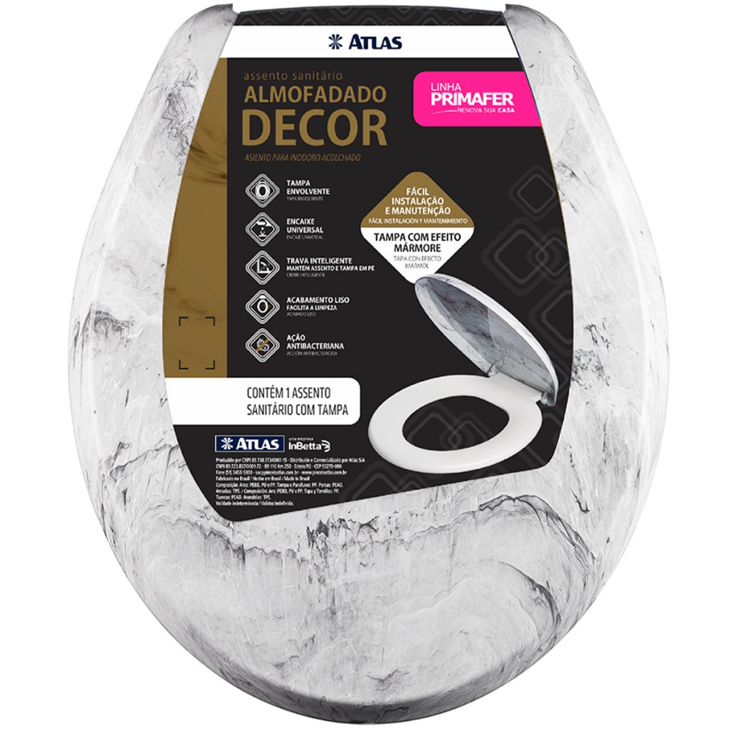 Assento Sanitário Decor Almofadado Atlas O Assento Sanitário Decor da Atlas foi desenvolvido especialmente para você que procura um produto de alta qualidade, resistente, fácil de limpar e com um design super moderno, que combina perfeitamente com ambientes marmorizados. Possui ação antibacteriana, proporcionando maior higiene e proteção para a saúde. Características: > Encaixe universal; > Ação antibacteriana; > Fácil instalação e manutenção; > Tampa com efeito marmorizado; > Acabamento liso, facilita a limpeza; > Possui trava inteligente, que mantém o assento e a tampa em pé. Especificações Técnicas: > Material do arco: PEBD, PU e PP; > Material da tampa e parafusos: tampa em PP e parafusos em PEAD; > Dimensões do produto (C x L x A) 44cm x 37cm x 4,0cm. - Marca: Atlas - Garantia: 12 meses contra defeitos de fabricação Vantagens de comprar na Brester: - Produto a pronta entrega. - Produto novo, com garantia de fábrica. - Nota fiscal para Pessoa Física e Pessoa Jurídica.