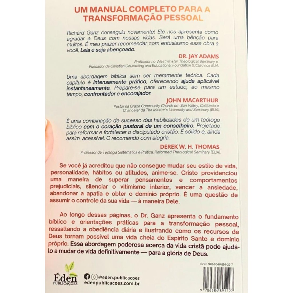 UM MANUAL COMPLETO PARA A TRANSFORMAÇÃO PESSOAL Se você já acreditou que não consegue mudar seu estilo de vida, personalidade, hábitos ou atitudes, anime se. Cristo providenciou uma maneira de superar pensamentos e comportamentos prejudiciais, silenciar o vitimismo interior, vencer a ansiedade, abandonar a apatia e obter o domínio próprio. É uma questão de assumir o controle da sua vida à maneira Dele.4 Ao longo dessas páginas, o Dr. Ganz apresenta o fundamento bíblico e teológico para a transformação pessoal, ressaltando a obediência diária e ilustrando como os recursos de Deus tornam possível uma vida cheia do Espírito Santo e domínio próprio. Ele enfatiza orientações práticas e diretas, movidas pela graça de Cristo. Esse é um material detalhado e abrangente que inclui desde listas de ações para resolução de problemas de forma bíblica, acrônimos para memorização de passos para superação de pensamentos prejudiciais, exemplos e histórias reais inspiradoras e muito mais. Sua proposta é ser mais do que uma leitura descontraída, este é um chamado à ação. O autor inclui diversas perguntas e exercícios aplicáveis ao fim de cada breve capítulo para reflexão e meditação. A abordagem poderosa apresentada pelo Dr. Ganz acerca da vida cristã pode ajudá lo a mudar de vida definitivamente para a glória de Deus. Sumário: Prefácio à Primeira Edição John F. MacArthur Agradecimentos Saudações! Parte 1: O início da vida sob controle 1. Como não viver a vida sob controle 2. A implementação da vida sob controle 3. O que significa, de fato, a vida sob controle? Parte 2: O cerne da vida sob controle 4. O princípio básico da vida sob controle 5. A graça da vida controlada Parte 3: A ação da vida sob controle 6. Vivendo a vida sob controle 7. Assuma o controle hoje 8. O estilo de vida sob controle 9. Ação de tomada de controle 10. Os benefícios da vida sob controle 11. O domínio próprio da vida sob controle Parte 4: Os desafios da vida sob controle 12. O enfrentamento de desafios na vida 13. As convicções poderosas da vida sob controle 14. A âncora da vida sob controle 15. Assuma o controle apesar das circunstâncias 16. A retidão da vida sob controle 17. As canções da vida sob controle Parte 5: A mentalidade da vida sob controle 18. O poder dos pensamentos na vida sob controle 19. Como mudar seus pensamentos 20. Assuma o controle da ansiedade 21. O poder das palavras sob controle 22. O compromisso da vida sob controle Parte 6: A amplitude da vida sob controle 23. Um exemplo da vida sob controle 24. A vida sob controle com princípios 25. Assuma o controle e viva com paixão 26. A chamada final ao controle Especificações: Capa Brochura | 256 págs. Tamanho: 16x23cm ISBN: 9786584891234 Editora: Éden Publicações