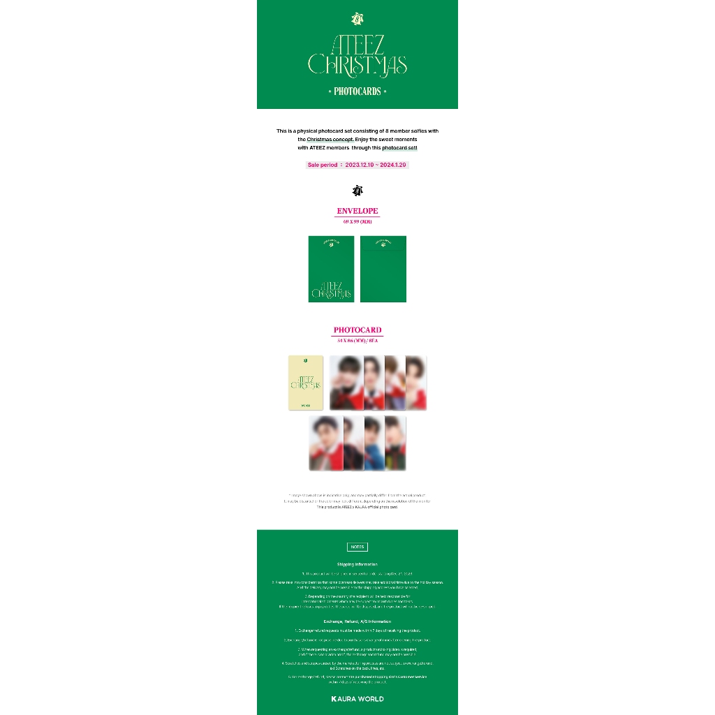 Carregado no Pacote: 23/12/08 Data LIBERADA Dec 21. 2023 Componentes de componentes ┗🎁Ateez - CONJUNTO DE CARTÃO FOTOGRÁFICO NATAL 🔎Envelope DE ENVELOPE: 69*99mm 🔎Cartão FOTOCARTÃO: 54*86mm | 8ea