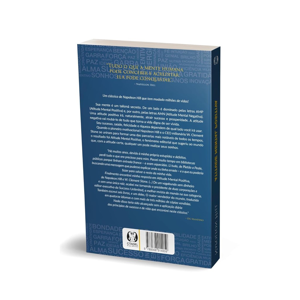 “Tudo o que a mente humana pode conceber e acreditar, ela pode conquistar.” ― NAPOLEON HILL Um clássico de Napoleon Hill que tem mudado milhões de vidas! Sua mente é um talismã secreto. De um lado é dominado pelas letras AMP (Atitude Mental Positiva) e, por outro, pelas letras AMN (Atitude Mental Negativa). Uma atitude positiva irá, naturalmente, atrair sucesso e prosperidade. A atitude negativa vai roubá-lo de tudo que torna a vida digna de ser vivida. Seu sucesso, saúde, felicidade e riqueza dependem de qual lado você irá usar. Quando o pioneiro motivacional Napoleon Hill e o CEO milionário W. Clement Stone se uniram para formar uma das parcerias mais notáveis de todos os tempos, o resultado foi Atitude Mental Positiva, o fenômeno editorial que sugeriu ao mundo que, com a atitude certa, qualquer um pode realizar seus sonhos. “Há muitos anos, devido à minha própria estupidez e defeitos, perdi tudo o que era precioso para mim. Passei muito tempo em bibliotecas públicas porque tinham entrada franca ― e eram aquecidas. Li tudo, de Platão a Peale, buscando uma mensagem que pudesse explicar onde eu tinha errado ― e o que eu poderia fazer para salvar o resto da minha vida. Finalmente encontrei minha resposta em Atitude Mental Positiva, de Napoleon Hill e W. Clement Stone. (...) De um vagabundo sem dinheiro e sem uma única raiz, acabei me tornando o presidente de duas corporações e editor-executivo da Success Unlimited, a melhor revista do mundo na sua categoria. Também escrevi seis livros, e um deles, O maior vendedor do mundo, traduzido em quatorze idiomas e com mais de três milhões de cópias vendidas. Nada disso teria sido alcançado sem a aplicação diária dos princípios de sucesso e de vida que encontrei neste clássico.” Og Mandino 23x16 cm 312 Páginas