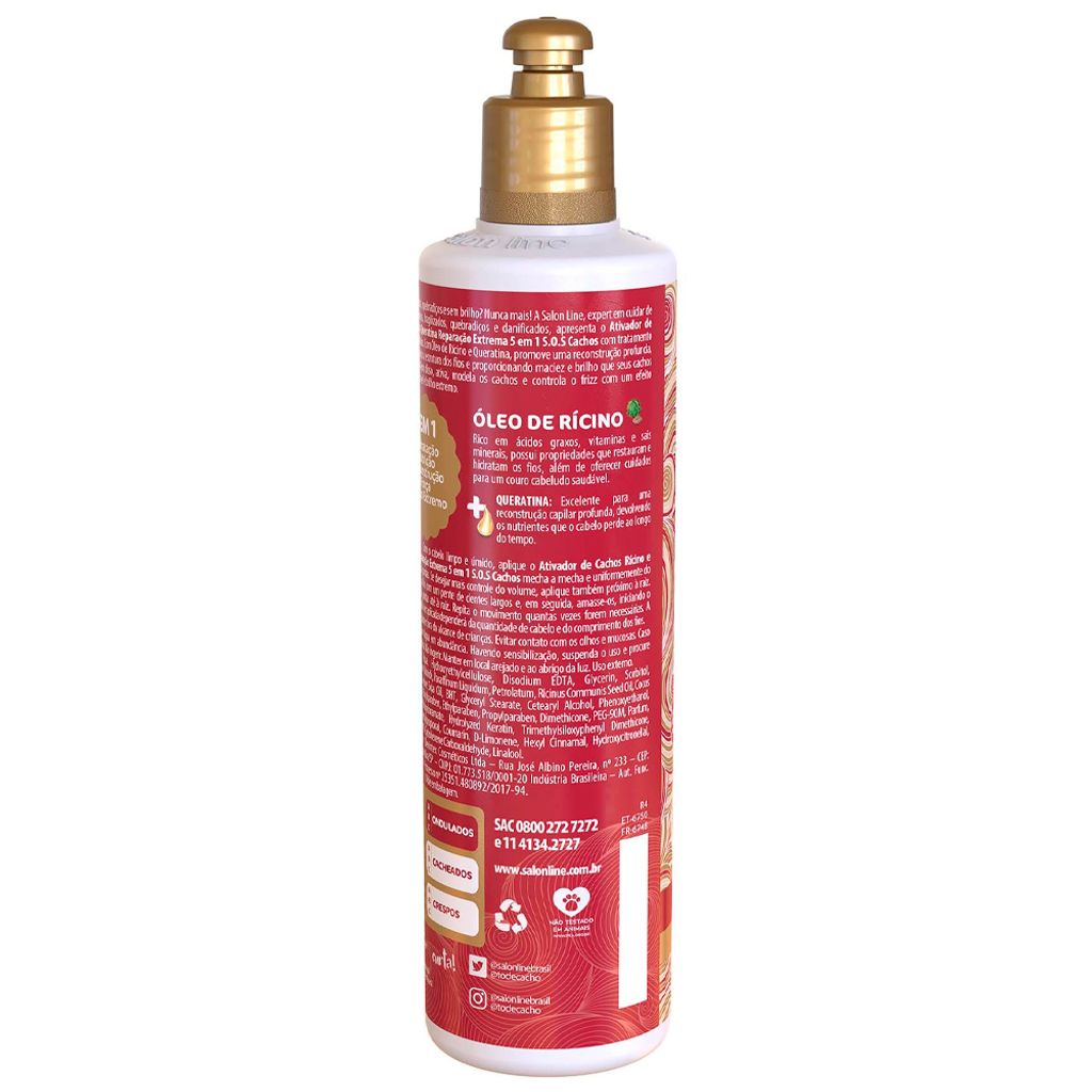 O Ativador De Cachos Rícino e Queratina Salon Line SOS Cachos Reparação Extrema proporciona uma reconstrução profunda, nutrindo e selando a estrutura dos fios, deixando-os macios e com um brilho divino. Sua poderosa fórmula com Óleo de Rícino Rico em ácidos graxos, vitaminas e sais minerais, possui propriedades que restauram e hidratam os fios, além de cuidar para um couro cabeludo saudável. E Queratina que é excelente para uma reconstrução capilar profunda, devolvendo os nutrientes que o cabelo perde ao longo do tempo. O Ativador De Cachos Rícino e Queratina SOS Cachos ativa, modela, controla seus cachos com um efeito umidificado incrível. Modo de usar: Com os cabelos limpos e úmidos, aplique o Ativador De Cachos Rícino e Queratina SOS Cachos mecha a mecha, uniformemente do comprimento às pontas, desembaraçando-as com um pente de dentes largos. Em seguida, amasse os cachos, iniciando o movimento das pontas até a raiz. Repita este movimento quantas vezes achar necessário para os cachos se formarem. A quantidade a ser aplicada dependerá do comprimento e volume dos fios. Não enxágue. Sobre a marca: A Salon Line, uma das maiores fabricantes de cosméticos do Brasil, há mais de 15 anos acompanha a evolução da mulher brasileira. Toda essa vivência fez da empresa uma profunda conhecedora do universo feminino. A empresa está sempre investindo em novas tecnologias e produtos, para oferecer aos clientes, consumidores e profissionais da área o que há de melhor no segmento cosmético mundial. Empresa 100% Nacional, que tem como objetivo especializar-se na beleza das mulheres brasileiras. Sempre desenvolvendo produtos de alta tecnologia, a Salon Line faz do seu slogan a sua realidade: Valorizando todas as belezas.