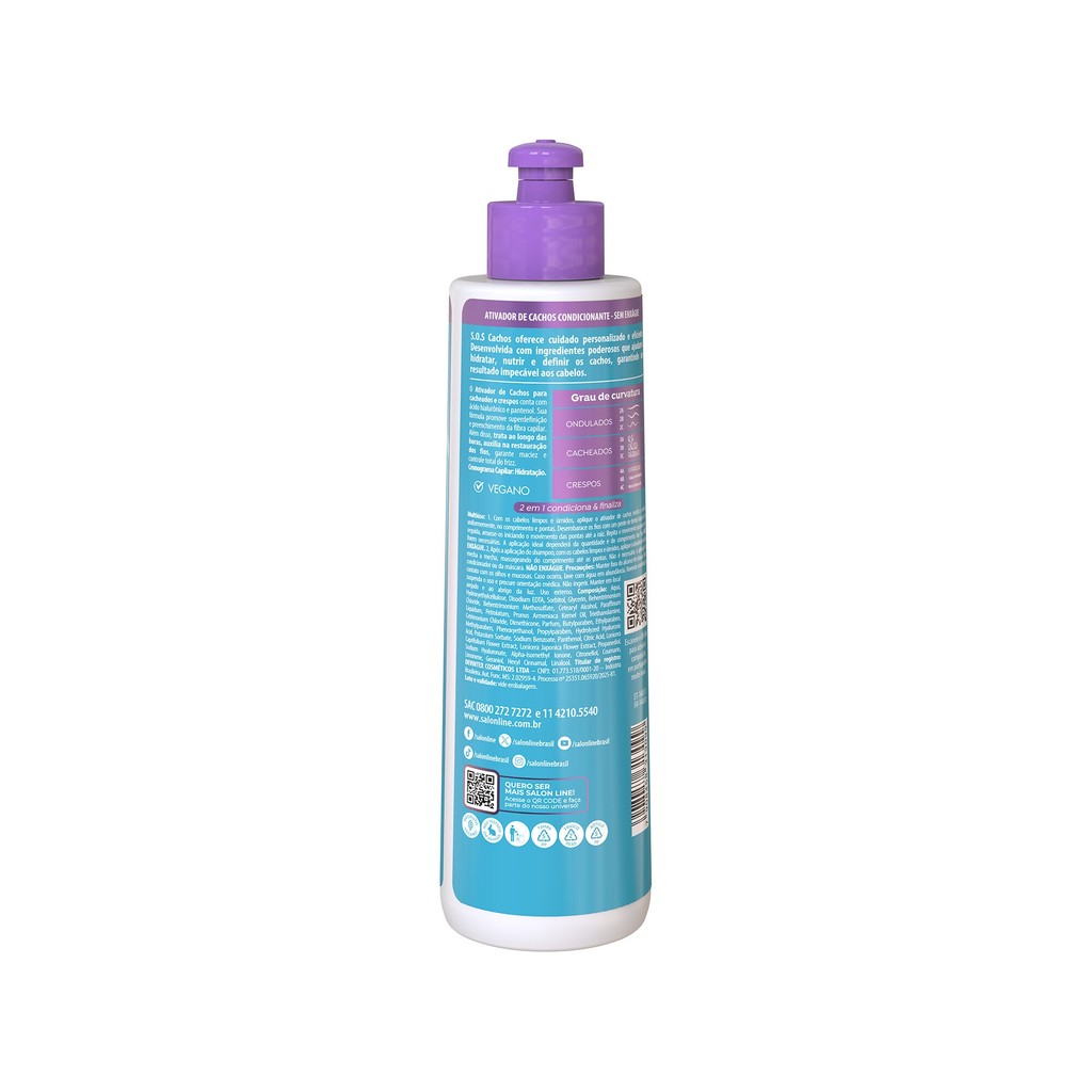 O Ativador de Cachos Desembaraçante S.O.S Cachos Ácido Hialurônico proporciona hidratação preenchedora, superdefinição dos cachos e controle de frizz, definição, além de auxiliar na restauração dos fios, garantindo cabelos macios e com brilho intenso. INDICAÇÕES Para quais tipos de cabelo? Cabelos ondulados, cacheados e crespos. Qual a indicação? Cabelos desidratados e opacos. Pode usar a partir de quantos anos? A partir de 12 anos. ATIVOS Quais os principais ativos? Ácido Hialurônico: alto poder de restauração capilar, revitaliza os fios, promovendo maciez e brilho intenso. D-Pantenol: conhecido pelo seu poder de hidratação, nutre os fios e auxilia no combate às pontas duplas do cabelo. MODO DE USO Qual a melhor forma de usar? Com o cabelo limpo e úmido, aplique o Ativador de Cachos mecha a mecha, uniformemente, do comprimento às pontas. Se desejar mais controle do volume, aplique também próximo da raiz. Desembarace os fios com um pente de dentes largos e, em seguida, amasse-os iniciando o movimento das pontas até a raiz. Repita o movimento quantas vezes forem necessárias, auxiliando na deginição dos cachos. A quantidade ideal a ser aplicada dependerá da quantidade de cabelo e do comprimento dos fios. Dica de uso Se desejar uma definição mais duradoura no day after, misture em seu borrifador água e o Ativador de Cachos Salon Line. Aplique sobre os fios do comprimento às pontas. Caso queira controlar o volume, aplique também próximo da raiz. CARACTERÍSTICAS É produto vegano? O Ativador de Cachos Desembaraçante S.O.S Cachos é vegano. É liberado? O produto não é liberado.