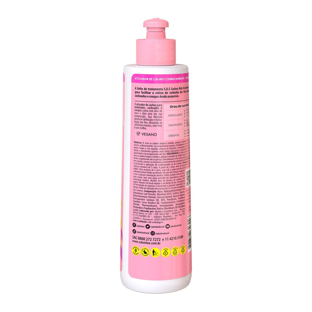 O Ativador de Cachos S.O.S Cachos Kids foi feito para facilitar a rotina dos pais no cuidado dos cabelos dos pequenos. Com propriedades nutritivas e hidratantes, o desembaraço dos fios se torna muito mais fácil e a definição, duradoura. INDICAÇÕES Para quais tipos de cabelo? Cabelos ondulados, cabelos cacheados e cabelos crespos. Qual a indicação? Cabelos ressecados, cabelos danificados e cabelos volumosos. Pode usar a partir de quantos anos? A partir de 03 anos. ATIVOS Quais os principais ativos? Óleo de coco: proporciona cabelos macios e nutrição aos fios, pois é rico em vitaminas do complexo B, C e ácidos graxos. Aloe vera: possui propriedades hidratantes e emolientes, deixando os fios bem selados e macios, proporcionando controle de frizz e brilho. MODO DE USO Qual a melhor forma de usar? Com os cabelos limpos e úmidos, aplique o Ativador de Cachos Salon Line mecha a mecha, uniformemente, no comprimento e pontas. Se desejar maior controle do volume, aplique também próximo à raiz. Desembarace os fios com um pente de dentes largos e, em seguida, amasse-os iniciando o movimento das pontas até a raiz. Repita o movimento de amassar e soltar quantas vezes forem necessárias para auxiliar na formação dos cachos. A quantidade ideal a ser aplicada dependerá da quantidade de cabelo e do comprimento dos fios. Dicas de uso Para resultados ainda melhores, utilize o shampoo, o condicionador, a máscara hidratante e o creme para pentear da linha S.O.S Cachos Kids da Salon Line. Salon Line recomenda Se o seu pequeno prefere volume controlado, sem frizz e com efeito umidificado, recomendamos dividir os fios em 6 a 8 partes e aplicar generosamente o Ativador de Cachos Salon Line mecha a mecha, enluvando da raiz às pontas. Mas, se prefere volumão, divida o cabelo em duas ou, no máximo, quatro partes e aplique o Ativador de Cachos Salon Line mecha a mecha, apenas no comprimento e pontas. Neste caso, não aplique na raiz. CARACTERÍSTICAS É produto vegano? O Ativador de Cachos 1kg S.O.S Cachos Kids Salon Line é vegano. É liberado? O Ativador de Cachos 1kg S.O.S Cachos Kids Salon Line não é liberado.