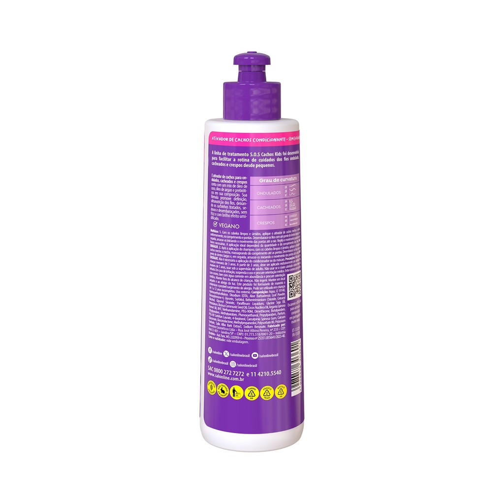 O Ativador de Cachos Infantil S.O.S Cachos Kids Definição foi feito para facilitar a rotina dos pais no cuidado dos cabelos das crianças, já que são produtos hipoalergênicos e dermatologicamente testados. Ele garante controle de volume, brilho umidificado, além de controlar o frizz e deixar os cachos definidos e com brilho intenso. INDICAÇÕES Para quais tipos de cabelo? Cabelos ondulados, cabelos cacheados, cabelos crespos e volumosos. Qual a indicação? Cabelos secos, cabelos desidratados e com frizz. Pode usar a partir de quantos anos? A partir de 3 anos. ATIVOS Quais os principais ativos? Manteiga de Karité: rica em ácidos graxos essenciais, promove nutrição capilar intensa, além de proporcionar brilho e maciez aos fios. Óleo de Argan: com alto poder de nutrição, garante hidratação para cabelos secos e quebradiços, revitaliza e garante muito brilho. MODO DE USO Qual a melhor forma de usar? Com o cabelo limpo e úmido, aplique o Ativador de Cachos Kids S.O.S Cachos Definição mecha a mecha, uniformemente, no comprimento e pontas. Se desejar mais controle do volume, aplique também próximo da raiz. Desembarace os fios com um pente de dentes largos e, em seguida, amasse-os iniciando o movimento das pontas até a raiz do cabelo. Repita o movimento de amassar e soltar quantas vezes forem necessárias para auxiliar na definição de cachos. A quantidade ideal de Ativador de Cachos Salon Line a ser aplicada dependerá da quantidade de cabelo e do comprimento dos fios. Dicas de uso Para melhores resultados, use a linha completa S.O.S Cachos Kids Definição da Salon Line. CARACTERÍSTICAS É produto vegano? O Ativador de Cachos Infantil S.O.S Cachos Kids Definição é vegano. É liberado? O Ativador de Cachos S.O.S Cachos Kids Definição não é liberado.