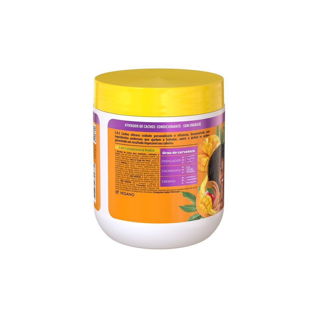 O Ativador de Cachos Manga Tradicional S.O.S Cachos conta com ingredientes especiais que promovem brilho e hidratação, ativa e define os cachos e os crespos, além de controlar o frizz e umidificar os fios. Condicionador sem enxágue. INDICAÇÕES Para quais tipos de cabelo? Cabelos ondulados, cabelos cacheados e cabelos crespos. Qual a indicação? Cabelos secos, cabelos desidratados e cabelos danificados. Pode usar a partir de quantos anos? A partir de 12 anos. ATIVOS Quais os principais ativos? Óleo de manga: rico em vitaminas e sais minerais, os benefícios da manga incluem ação hidratante e nutritiva, além de fortalecer os fios, garantindo brilho e maciez. Queratina: excelente para uma reconstrução capilar profunda, devolve os nutrientes que o cabelo perde ao longo do tempo. MODO DE USO Qual a melhor forma de usar? Com o cabelo limpo e úmido, aplique o ativador de cachos mecha a mecha, uniformemente, do comprimento às pontas. Se desejar mais controle do volume, aplique também próximo a raiz. Desembarace os fios com um pente de dentes largos e, em seguida, amasse-os iniciando o movimento das pontas até a raiz. Repita o movimento quantas vezes forem necessárias, auxiliando na formação dos cachos. A quantidade ideal a ser aplicada dependerá da quantidade de cabelo e do comprimento dos fios. Dicas de uso Você pode usar o Ativador de Cachos Manga Tradicional S.O.S Cachos para uma finalização poderosa e rápida. Veja o passo a passo: Passo 1) Com o cabelo limpo e úmido, separe uma mecha e aplique uma boa quantidade de ativador de cachos por todo o comprimento dos fios e pontas. Passo 2) Com os dedos entre a mecha, feche a mão e deslize por todo o comprimento, da raiz às pontas. Desse modo, você irá separar os cabelos em fitas. Passo 3) Finalizada a separação da mecha, segure as fitas pela ponta e inicie o movimento de amassar de baixo para cima em direção à cabeça. Esse amassadinho formará ondas. Passo 4) faça o ritual por todo o cabelo, deixando as fitas bem umedecidas. Não esqueça de amassar bem. Passo 5) Deixe o cabelo secar naturalmente e pronto. Se quiser, use o difusor. Salon Line recomenda Se desejar uma definição mais duradoura no Day After, misture em seu borrifador água e o Ativador de Cachos Salon Line. Aplique sobre os fios, do comprimento às pontas. Caso queira controlar o volume, aplique também próximo a raiz. CARACTERÍSTICAS É produto vegano? O Ativador de Cachos S.O.S Cachos Óleo de Manga é vegano. É liberado? O Ativador de Cachos S.O.S Cachos Óleo de Manga não é liberado.