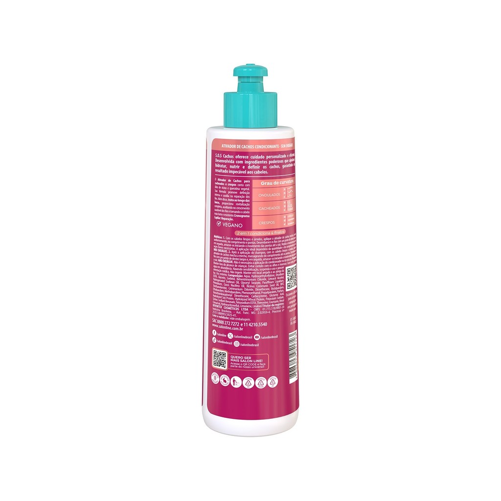 O Ativador de Cachos Rícino e Queratina Reparação Extrema 5 em 1 S.O.S Cachos conta com fórmula poderosa que promove uma reconstrução capilar profunda, cabelo macio e brilho no cabelo, além de garantir efeito umidificado e controle total do frizz. INDICAÇÕES Para quais tipos de cabelo? Cabelos cacheados e cabelos crespos. Qual a indicação? Cabelos ressecados, cabelos fragilizados, cabelos quebradiços e danificados. Pode usar a partir de quantos anos? A partir de 12 anos. ATIVOS Quais os principais ativos? Óleo de Rícino: rico em ácidos graxos, vitaminas e sais minerais, possui propriedades que restauram e garantem hidratação para o cabelo, além de oferecer cuidados para um couro cabeludo saudável. Queratina: excelente para uma reconstrução capilar profunda, devolvendo os nutrientes que o cabelo perde ao longo do tempo. MODO DE USO Qual a melhor forma de usar? Com o cabelo limpo e úmido, aplique o Ativador de Cachos Salon Line mecha a mecha, uniformemente, do comprimento às pontas. Se desejar mais controle do volume, aplique também próximo à raiz. Repita o movimento quantas vezes forem necessárias. A quantidade ideal a ser aplicada dependerá da quantidade de cabelo e do comprimento dos fios. Dicas de uso Para melhores resultados, utilize o shampoo, o condicionador, a máscara hidratante e o creme para pentear da linha Rícino e Queratina S.O.S Cachos da Salon Line. CARACTERÍSTICAS É produto vegano? O Ativador de Cachos S.O.S Cachos Rícino e Queratina Salon Line não é vegano. É liberado? O Ativador de Cachos S.O.S Cachos Rícino e Queratina Salon Line não é liberado.