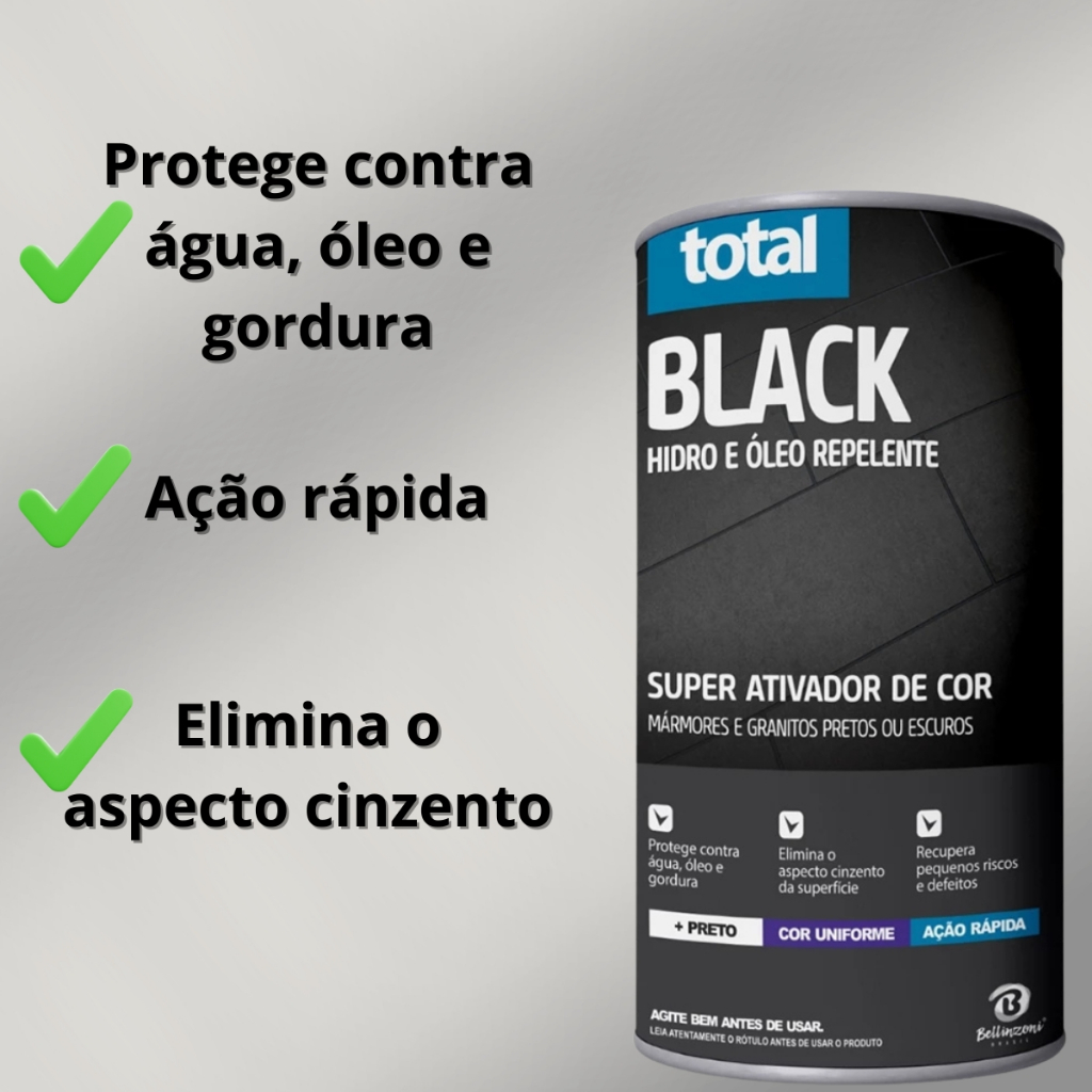 Total Black Bellinzoni – Ativador de Cor para Mármore e Granito Pretos O Total Black Bellinzoni é um super ativador de cor desenvolvido especialmente para mármores e granitos pretos ou de tonalidade escura, proporcionando um escurecimento profundo, uniforme e duradouro da superfície tratada. Sua fórmula exclusiva de alta performance possui elevada capacidade de penetração, restaurando a cor natural da pedra e eliminando o aspecto acinzentado, esbranquiçado ou conhecido como “efeito russo”. Com ação rápida e eficaz, o produto promove a reativação intensa da cor preta, escurecendo os cristais componentes de determinados materiais e devolvendo o brilho e a elegância original da superfície. Além do efeito estético, o Total Black oferece proteção contra água, óleo e gordura, ajudando a preservar o material por muito mais tempo. A aplicação é simples e prática, realizada apenas com o auxílio de uma estopa ou pano, tornando o produto ideal tanto para uso profissional quanto uso doméstico, desde que respeitadas as instruções de aplicação. Superfícies Indicadas para Aplicação Bancadas Pisos Rodapés Alisares Superfícies em mármore preto Superfícies em granito preto ou escuro Finalidade do Produto Ativar e intensificar a cor preta de mármores e granitos Eliminar o aspecto cinzento ou esbranquiçado Uniformizar a tonalidade natural da pedra Proteger contra infiltração de água, óleo e gordura Valorizar o acabamento e a estética da superfície Instruções de Uso Certifique-se de que a superfície esteja totalmente limpa, seca e livre de ceras, poeira ou resíduos. Aplique o Total Black com o auxílio de uma estopa ou pano limpo, espalhando de maneira uniforme e sempre no mesmo sentido. Cubra toda a área a ser tratada. Caso haja excesso de produto, remova imediatamente com flanela, pano ou estopa limpa e seca. Recomenda-se realizar teste prévio em pequena área antes da aplicação total. Atenção: após aplicado, não é possível remover o produto absorvido pela pedra. Importante Produto indicado exclusivamente para pedras pretas ou escuras. Não utilizar em superfícies claras. Palavras-chave ativador de cor, total black bellinzoni, mármore preto, granito preto, restaurador de pedra, escurecedor de mármore, escurecedor de granito, proteção para pedra, tratamento de mármore, tratamento de granito, produto para pedra natural, revitalizador de pedra, impermeabilizante para mármore, impermeabilizante para granito