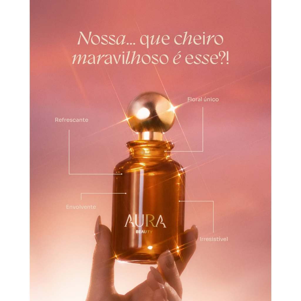 O despertar de uma deusa acontece quando o invisível perfuma. Não é só um perfume. É um ritual de presença. O primeiro Eau de Toilette de AURA Beauty emerge, como uma brisa antiga que já existia antes mesmo de você saber. Inspirado nas raízes oníricas e mitológicas da marca, este Deo Colonia é a fragrância que traduz a essência da AURA: uma beleza sensorial, intuitiva, mística e corajosa — feita para mulheres que vivem com brilho nos olhos e alma à flor da pele. É o perfume de um portal que se abre. Como se cada borrifada fosse um véu entre o mundo real e o sagrado. Floral celestial, com toque de pele iluminada e calor suave de uma deusa em movimento. TOPO Onírico: inspirado em sonhos, intuições e desejos traz notas frescas e marcantes de Neroli, Bergamota e Frutas Vermelhas CORPO Mitológico: carrega a força das deusas modernas — livres, sensuais e conscientes, com sopros de flores brancas como o jasmim, tuberosa e flor de laranjeira FUNDO Divino e terreno: um elo entre o corpo floral e a alma amadeirada e adocicada com notas de musk, amber e gourmand. Sensorial: para sentir na pele e irradiar na alma.