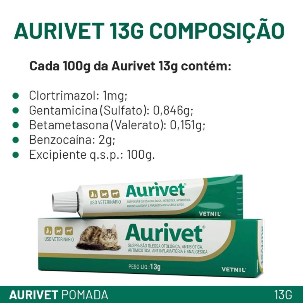 Aurivet Suspensão oleosa otológica INDICAÇÃO Indicado para o tratamento das otites externa aguda e crônica, fúngicas e bacterianas de cães e gatos. MODO DE USAR Produto de uso tópico. • Cães com até 15 kg de peso: instilar 4 gotas ns orelha, 2 (duas) vezes ao dia, por 15 dias consecutivos. • Cães com mais de 15 kg de peso: instilar 8 gotas na orelha, 2 (duas) vezes ao dia, por 15 dias consecutivos. • Gatos: instilar 4 gotas no ouvido, 2 (duas) vezes ao dia, por 15 dias consecutivos. É importante massagear a orelha externo após cada aplicação para garantir a perfeita distribuição do medicamento. O tratamento deve ser mantido por 48 horas após o desaparecimento dos sintomas. Deve ser feita uma limpeza prévia das orelhas para que o tratamento se torne eficaz. Não há relatos de efeitos colaterais e/ou reações adversas aos componentes da fórmula.