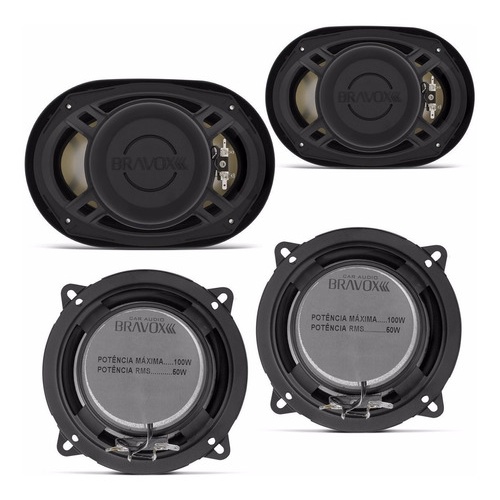 # OESTESOM # Descrição Alto Falantes Bravox: Os Triaxiais e o Quadraxial 6x9” da Linha X possuem design arrojado e inovador e se adaptam perfeitamente aos novos conceitos de carros “tunados”, aliando potência, desempenho e durabilidade. De simples instalação, podem ser instalados em qualquer veículo com ou sem adaptação nas portas dianteiras, traseiras, tampão e painel. Características Alto Falantes 6x9: - Modelo: B3X69X - Tamanho: 6X9’ POLEGADAS - Potência Real: 70WRMS - Impedância: 4OHMS - Cone injetado em polipropileno - Tweeter e midrange de Mylar - Carcaça injetada em termoplástico - Borda injetada em Santoprene ® - Bobina em corpo de alumínio - Código: 9-6057/072 - Sensibilidade dB/W/m: 88 - Fo Hz: 65 - Resposta Fq. Hz: 50 - 20K - Potência máxima WMAX. Watts: 140 Watts - Potência real WRMS. Watts: 70 Wrms - Altura cm: 11,9 - Diâmetro cm: 26,1x17,6 Características Alto Falantes 5 Polegadas: - Tamanho: 5"POLEGADAS - Potência Real Wrms: 50WRMS - Impedância: 4OHMS - Cone injetado em polipropileno - Bobina em corpo de alumínio - Borda injetada em santoprene - Ímã de fluxo magnético - Tweeter Mylar e Midrange Especificações Técnicas 5 Polegadas: - Modelo: B3X50 X - Código: 9-6073/048 - Polegadas: 5" - Impedância: 4 - Sens. dB/W/m: 89 - Fo Hz: 100 - RESP.Fq. Hz: 70 - 20K - WMAX. Watts: 100 - WRMS. Watts: 50 - Altura mm: 54 - Diâmetro mm: 130 CONTEÚDO DA EMBALAGEM - 2 - Alto-falantes 5" Bravox B3X50X - 50W RMS cada (sem tela) - 2 - Alto-falantes 6x9" Bravox B3X69X - 70W RMS cada (com tela)