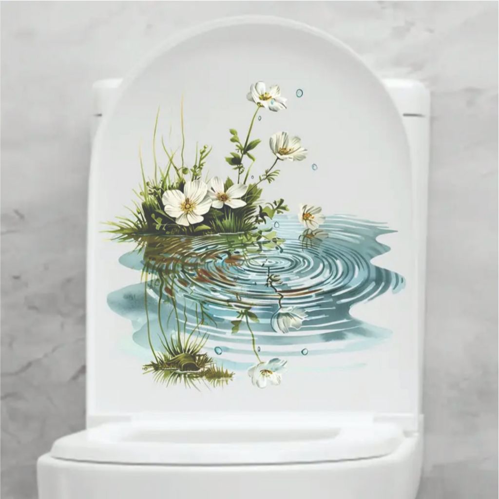 1 unidade de Adesivo Decorativo para Vaso Sanitário com Paisagem de Flores de Lagoa, Autoadesivo de Plástico Cerâmico Impermeável, Acabamento Fosco, Formato Irregular, Decoração de Banheiro com Tema de Plantas