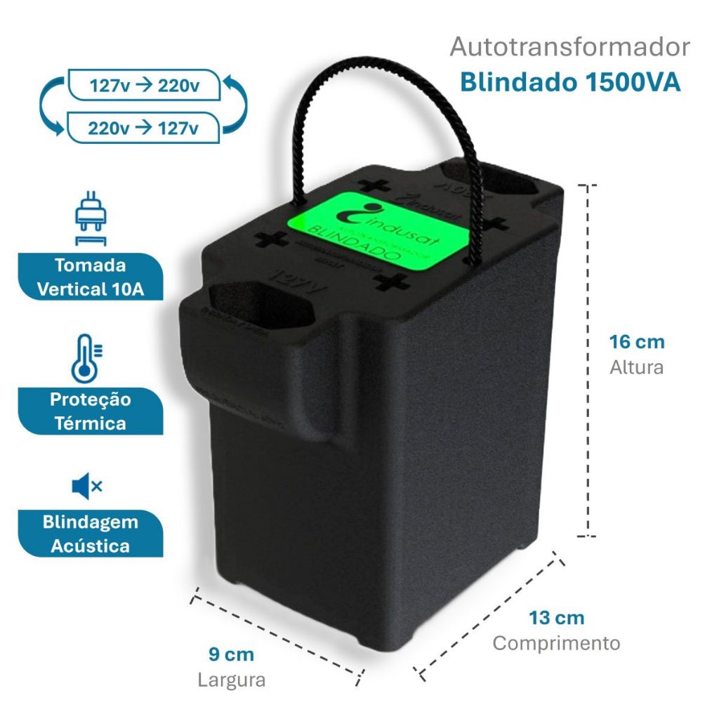 O autotransformador BLINDADO INDUSAT 1500va - 975W tem tomada 20A, converte 110v para 220v e 220v para 110v, possui proteção térmica e blindagem acústica. É um produto fabricado com tecnologia que garante excelente funcionamento com durabilidade e segurança ao usuário. Nessa gama de produtos temos a confiabilidade da nossa marca, a qualidade e o suporte técnico de fábrica com mais de 40 anos de tradição no mercado. Modelos: 500va / 750va / 1010va / 1500va / 2000va / 3000va / 5000va Tomada 20A 3 pinos NBR 14136 127v/220v <--> 220v/127v Garantia - 1 ano Marca/Fabricante - Indusat Frequência - 60hz Potência - 1500VA / 975W Indicação de Uso - Centrífuga / Cortador de Grama / Freezer (360l, 420l) / Geladeira (360l, 440l) / Torradeira -> Até 975w
