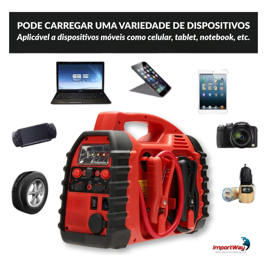 Auxiliar De Partida 6x1 Importway Com Compressor De Ar Portátil 12V Powerbank Luz LED E Saída USB Automotiva