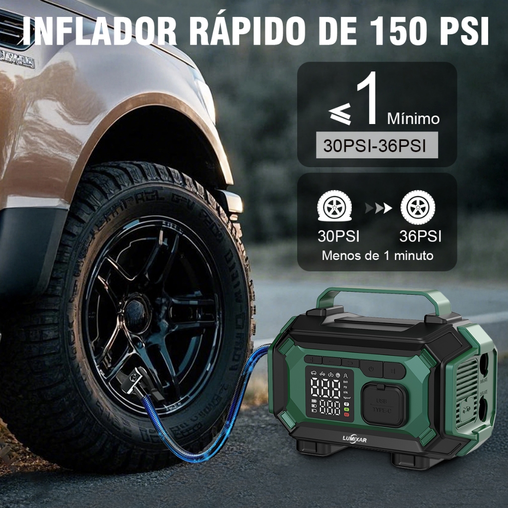 **Auxiliar Partida Carro Moto 12V com Compressor Ar Portátil 4 em 1** **Por Que Escolher Este Auxiliar de Partida e Compressor de Ar para Carro** Este dispositivo é a solução completa que você precisa para imprevistos na estrada. Ele combina quatro ferramentas essenciais em um único equipamento portátil e eficiente, resolvendo rapidamente problemas como bateria descarregada, pneu com baixa pressão e falta de energia para dispositivos — ideal para motoristas que valorizam segurança e praticidade. **Principais Funcionalidades e Vantagens** --Multifuncionalidade 4 em 1 Sua aliada completa para emergências veiculares: funciona como auxiliar de partida para bateria 12V (compatível com carro e moto), compressor ar portátil de 150psi (para inflar pneus, bolas e colchões), power bank recarregável (para carregar smartphones/tablets) e lanterna LED com modo SOS (para sinalização em situações criticas). --Segurança e Tranquilidade nas Viagens Equipado com grampos inteligentes que oferecem proteção anti-inversão de polaridade, anti-curto circuito e anti-sobrecarga. A lanterna SOS aumenta sua segurança em paradas noturnas ou isolamento. Além disso, resiste a temperaturas entre -20°C e 60°C, garantindo durabilidade em diferentes climas. --Alta Performance e Portabilidade O auxiliar de partida liga o motor em 3 segundos por tentativa (intervalo de 1 minuto), sem bateria externa extra. O compressor tem precisão de ±0.1BAR e desliga auto em 30s de inatividade. Seu design compacto (205x105x58mm) cabe facilmente no porta-malas, perfeito para viagens longas ou deslocamentos diários. **Cenarios de Uso Pratico** --Quando a bateria do carro descarrega Conecte os grampos (vermelho no polo positivo, preto no negativo) à bateria 12V. Espere o indicador verde (conexão correta) e ligue o motor (max 3s por tentativa). --Quando o pneu tiver baixa pressão Conecte a mangueira do compressor ao pneu (use o adaptador adequado), ajuste a pressão desejada via botões “+/-” e ligue o dispositivo — ele para auto ao alcançar a pressão alvo. --Para carregar dispositivos eletronicos fora de casa Use as portas USB (5V/3A para carregamento rápido ou 5V/2A para consumo baixo) ou a entrada Type-C para recarregar smartphones, tablets e outros aparelhos. --Em emergências noturnas Pressione o botão da lanterna por 3 segundos para ligar: escolha luz contínua (para manutenções) ou intermitente (modo SOS) para sinalizar sua posição. **Especificacoes Tecnicas e Seguranca** Compatibilidade: Exclusivo para veículos de 12V (não use em baterias de 24V). Pressão do compressor: 150psi (ideal para pneus de carro, moto e bicicleta). Saídas/Entrada: 2 portas USB (5V/3A + 5V/2A) + entrada Type-C (5V/3A). Tempo de carregamento: 4 a 5 horas (com adaptador 5V/3A, não incluso). Segurança: Não use em ambientes úmidos/explosivos; mantenha crianças/animais afastados do compressor (parte pode aquecer). **Conteudo da Embalagem** 1- Auxiliar Partida Carro Moto 12V com Compressor Ar Portátil 1- Par de grampos inteligentes para bateria 12V 1- Mangueira de ar resistente à pressão 1- Adaptadores (para pneu de carro, moto, bicicleta, bolas e colchões) 1- Cabo Type-C para carregamento 1- Bolsa de armazenamento portátil 1- Manual de instruções simplificado (em português)