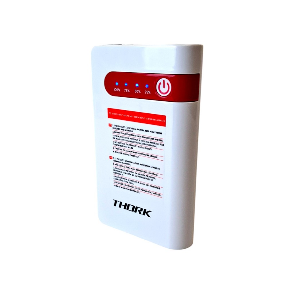 * TENSÃO DE OPERAÇÃO: 12V DC. * TENSÃO DE RECARGA DO DISPOSITIVO: 5V DC. (FONTE DE ALIMENTAÇÃO NÃO INCLUSA). RECOMENDAMOS O USO DE FONTES COM CAPACIDADE SUPERIOR A 2.1A (AMPERES) PARA UMA RECARGA EFICIENTE. *COMPATÍVEL APENAS COM VEÍCULOS QUE UTILIZAM BATERIAS DE 12V DC. ((ATENÇÃO)) OBSERVAÇÃO PARA A FUNÇÃO DE PARTIDA EM VEÍCULOS: apenas para veículos com motores inferiores a 1.6 ou inferiores a 4 cilindros. *AMPERAGEM DE PICO: 250 ~ 350AP. (FUNÇÃO DE PARTIDA). *FUNÇÃO: Recarregar dispositivos que utilizam porta USB e START EM VEÍCULOS UTILIZANDO A GARRA QUE ACOMPANHA O KIT. *GARRA DE PARTIDA: Utilizando a garra fornecida no kit, é possível dar partida em veículos que tiveram suas baterias descarregadas. (ELE NÃO É COMPATÍVEL COM TODOS OS VEÍCULSO DO MERCADO). SOMENTE UTILIZE A GARRA QUE ACOMPANHA O KIT NA FUNÇÃO START. ((ATENÇÃO)) * TIPO DE BATERIA: Íon de Lítio Polímero (Li-Po). OBSERVAÇÃO: Não tente abrir ou reparar a bateria. (AS BATERIAS DE ÍON Li-Po NÃO DEVEM SER REPARADAS). * TENSÃO DE SAÍDA PARA IGNIÇÃO: 12V DC. * TENSÃO USB DE RECARGA (OUT): 5V DC / 2.1A. * PORTA DE ENTRADA: Conector Tipo C (IN). (APENAS PARA RECARGA DO ACUMULADOR). OBSERVAÇÃO: Inclui (1x) cabo de alimentação PARA A PORTA USB com conector Tipo C. ((ATENÇÃO)) * O ITEM NÃO INCLUI FONTE DE ALIMENTAÇÃO AC - 110/220VAC. OBSERVAÇÃO: Não acompanha fonte de alimentação AC. Sugerimos o uso de fontes turbo com capacidade superior a 2.1A para uma recarga rápida do dispositivo. * TEMPO DE RECARGA: Aproximadamente de 4 a 12 horas (dependendo da eficiência da fonte e do cabo utilizado). ((ATENÇÃO)) * TEMPERATURA DE OPERAÇÃO DO ACUMULADOR: -20° a 50°. OBSERVAÇÕES SOBRE A TEMPERATURA DE OPERAÇÃO 1) NÃO EXPOR O ACUMULADOR AO SOL; MANTER O APARELHO EM AMBIENTE AREJADO E FRESCO. 2) NÃO DEIXAR O APARELHO DENTRO DE VEÍCULOS FECHADOS AO SOL. 3) NÃO EXPOR O APARELHO AO FOGO. CARACTERÍSTICAS DO PRODUTO: * Possui um botão para ligar o aparelho. * SISTEMA INTELIGENTE: O APARELHO DESLIGA AUTOMATICAMENTE SE NÃO ESTIVER EM FUNCIONAMENTO. * 4 LEDs indicadores do nível de carga da bateria (25% / 50% / 75% / 100%). * Lanterna com modos de PISCA / SOS / DIRECIONADA. (Botão na parte superior para alternar os modos da lanterna). * Saída de carregamento USB (OUT): 5V DC / 2.1A. * Entrada de carga (IN): Conector Tipo C, para recarregar o acumulador: 5V DC ~ 9V DC / 2.1A. * Acompanha garra inteligente que se conecta diretamente à bateria do veículo nos polos positivo e negativo para executar a função IGNIÇÃO. ((ATENÇÃO)) SOBRE A GARRA DE PARTIDA DO VEÍCULO: * A GARRA CONTÉM AS CORES VERMELHA (POLO POSITIVO) E PRETA (POLO NEGATIVO). NÃO DEVEM SER CONECTADAS INVERTIDAMENTE EM HIPÓTESE ALGUMA. * A GARRA POSSUI UM PEQUENO BOTÃO DE ACIONAMENTO RÁPIDO E DIRETO COM A IGNIÇÃO. (APENAS UTILIZAR EM VEÍCULOS COM A BATERIA MUITO DESCARREGADA). * A GARRA POSSUI PROTEÇÃO CONTRA CURTO-CIRCUITO. (EM CASO DE CURTO-CIRCUITO, ELA EMITE UM ALARME SONORO E FICA VERMELHA, IMPOSSIBILITANDO O USO DO ITEM). * A PRINCIPAL FUNÇÃO DO APARELHO É LIGAR O VEÍCULO QUANDO A BATERIA ESTIVER BAIXA, NÃO CONSEGUINDO LIGAR NORMALMENTE. * APÓS LIGAR O VEÍCULO, REMOVA IMEDIATAMENTE O ACUMULADOR. * ESTE PRODUTO NÃO DEVE SER ABERTO EM HIPÓTESE ALGUMA. CONTÉM UMA BATERIA INTERNA QUE NÃO DEVE SER VIOLADA, COM RISCO DE EXPLOSÃO. * O APARELHO UTILIZA UMA BATERIA DE ÍON DE LÍTIO POLÍMERO SELADA. * O FUNCIONAMENTO DO EQUIPAMENTO DEPENDE DE UMA CARGA MÍNIMA NA BATERIA. * ESTE PRODUTO DEVE SER MANTIDO FORA DO ALCANCE DE CRIANÇAS. M* ANTENHA A GARRA DESCONECTADA ATÉ O MOMENTO DE UTILIZAR O PRODUTO. APÓS EXECUTAR SUA FUNÇÃO, REMOVA-A E GUARDE O MATERIAL. * LED DE INDICAÇÃO DE CARGA: ((ATENÇÃO)) Os LEDs indicam as seguintes porcentagens de carga: 25%, 50%, 75% e 100%. OBSERVAÇÕES SOBRE AS PORCENTAGENS: * Durante o carregamento de dispositivos pela porta USB, pode ser utilizado de 100% a 25% de carga. * Quando a carga estiver em 25%, RECARREGUE IMEDIATAMENTE O ACUMULADOR E NÃO UTILIZE A FUNÇÃO DE PARTIDA DO VEÍCULO. * Com 50% de carga, NÃO UTILIZE A FUNÇÃO DE PARTIDA DO VEÍCULO. * Com 75% de carga, PODE-SE UTILIZAR A FUNÇÃO DE PARTIDA DO VEÍCULO. * Com 100% de carga, o aparelho está pronto para utilizar a função de partida do veículo. * A FUNÇÃO DE PARTIDA DO VEÍCULO, UTILIZANDO AS GARRAS QUE ACOMPANHAM O KIT, SÓ PODE SER UTILIZADA COM 75% DE BATERIA OU MAIS. * NUNCA DEIXE O APARELHO COM A BATERIA TOTALMENTE DESCARREGADA POR MAIS DE 48 HORAS. SEMPRE QUE CHEGAR AOS 25% DE CARGA, RECARREGUE O DISPOSITIVO. * POR SER UMA BATERIA, MESMO COM CARGA EM 100% TOTALEMNTE CARREGADA E SEM UTILIZAR ELA TERÁ PERDAS NATURAIS DE CARGA COM O TEMPO SEM UTILIZAÇÃO. MANTENHA SEMPRE O ITEM RECARREGADO. ((ATENÇÃO)) LEIA O MANUAL ANTES DE UTILIZAR O EQUIPAMENTO. NO MANUAL CONTÉM INFORMAÇÕES NECESSÁRIAS SOBRE C UIDADOS E UTILIZAÇÃO DO ITEM. CONTEÚDO DO KIT: 1x ACUMULADOR DE BATERIA COM CAPACIDADE DE 7500mAh. (CONTENDO UMA PORTA USB). 1x GARRA PARA A FUNÇÃO DE PARTIDA EM VEÍCULOS. 1x CASE COM ZIPER. COMPOSIÇÃO: