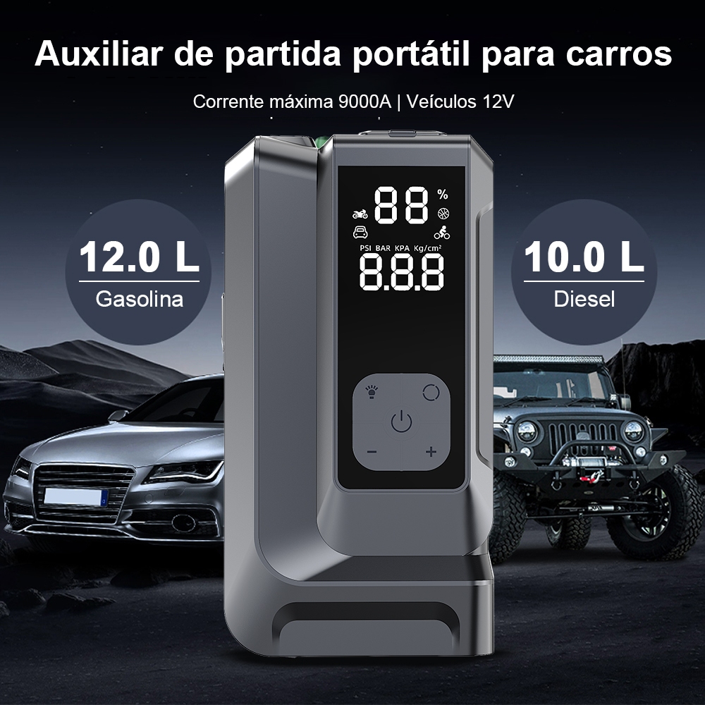 Auxiliar Partida Bateria Compressor Ar Portatil 26800 mAh,Para Automotiva Moto Automático 12V Com Power Bank