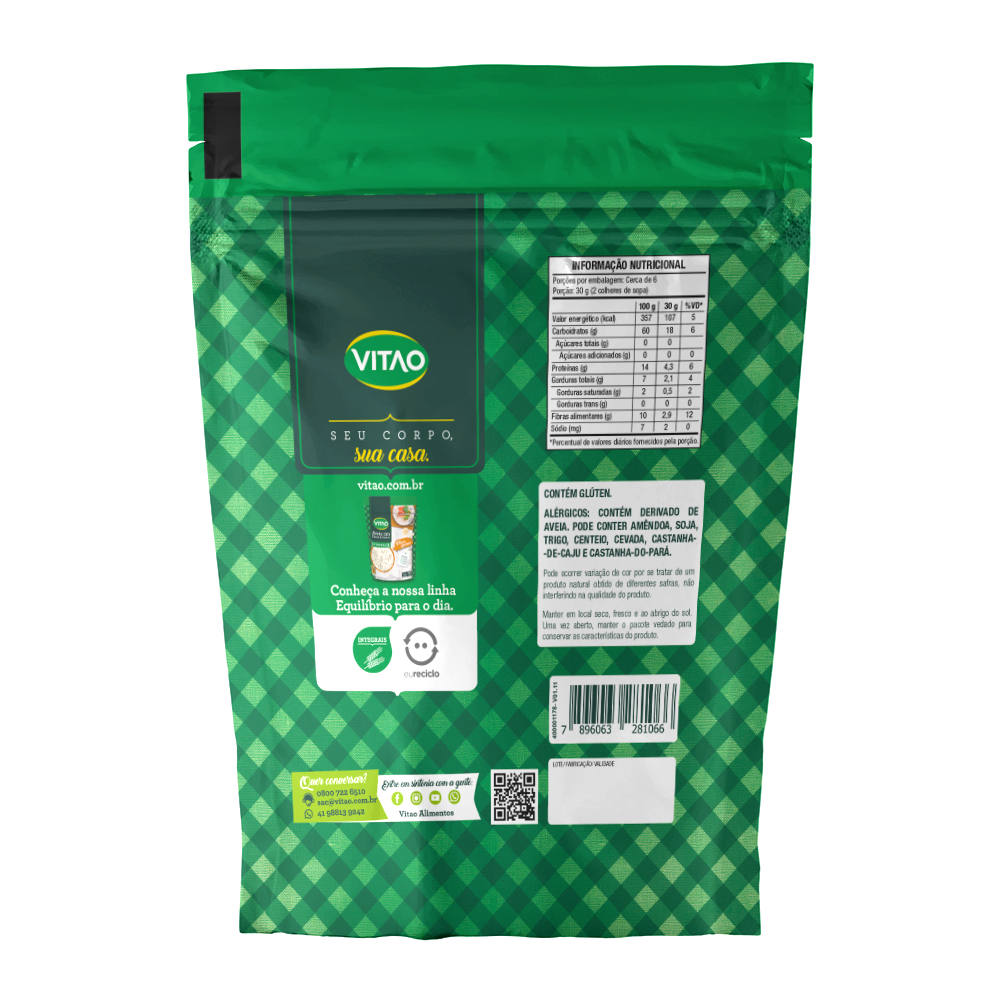 A aveia em flocos finos da Vitao é uma opção saudável e nutritiva para incorporar em sua dieta diária. Feita a partir dos grãos de aveia integral, ela oferece uma textura delicada e sabor suave. Rica em fibras solúveis, vitaminas e minerais, a aveia em flocos finos é conhecida por seus benefícios para a saúde cardiovascular e digestiva. Versátil, pode ser consumida em mingaus, adicionada em smoothies, iogurtes, bolos e outras receitas. Desfrute dos benefícios da aveia em flocos finos Vitao, cuidando do seu corpo de forma deliciosa e nutritiva. INGREDIENTES: Aveia em flocos finos. ALÉRGICOS: CONTÉM DERIVADO DE AVEIA. PODE CONTER AMÊNDOA, SOJA, TRIGO, CENTEIO, CEVADA, CASTANHA-DE-CAJU E CASTANHA-DO-PARÁ. CONTÉM GLÚTEN. INTEGRAL, FONTE DE FIBRAS.