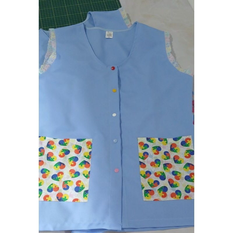 Lindo avental para professora e ou cuidadora, confeccionado em tecido Oxford e tricoline. Disponível em 4 tamanhos; personalizados com nome. Ao efetuar a compra informar o nome a ser bordado. Verifique as medidas na tabela pois não trocamos peças personalizadas. Medidas: tamanho P =busto 100, cintura 90, quadril 100, comprimento 70 tamanho M =busto 110, cintura 100, quadril 112, comprimento 73 tamanho G =busto 112, cintura 102, quadril 114, comprimento 74 tamanho GG =busto 126, cintura 118, quadril 132, comprimento 79