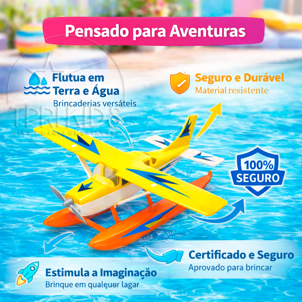 ✈️ Hidroavião Aviãozinho de Brinquedo Flutuante TPRI KIDS O Hidroavião TPRI KIDS é um brinquedo divertido, colorido e cheio de possibilidades! Desenvolvido para flutuar na água e também brincar fora dela, ele vem com rodinhas funcionais, permitindo que a criança use a imaginação tanto no chão quanto em ambientes aquáticos. Com design lúdico e cores vibrantes, estimula a criatividade, coordenação motora e o faz-de-conta, além de ser um ótimo item para decoração do quarto infantil. 🔹 Especificações do produto: Material: Plástico resistente Possui 4 rodinhas Flutua na água Largura: 28 cm Altura: 9 cm Comprimento: 22 cm Design colorido e infantil 🎁 Perfeito para presentear e garantir momentos de diversão dentro e fora da água! 👉 Garanta já o seu e leve mais diversão para o dia a dia das crianças!