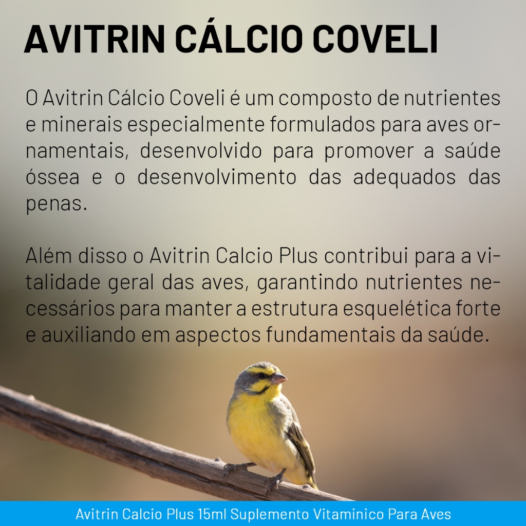 A LeluPets nasceu de uma paixão e dedicação de aproximadamente 20 anos de experiência nessa área tão incrível. Desde o início de nossa história, já são mais de 100 mil clientes atendidos. Estamos aqui determinados em fazer a diferença, democratizando e simplificando o cuidado com o seu pet para oferecer a melhor experiência para você e seu amiguinho. Mantemos nossas orelhas em pé, atentos às novidades do mundo pet para trazê-las até você. Nós somos apaixonados por pets! O seu pet é também da nossa família! Avitrin Cálcio Plus 15ml Suplemento Vitamínico Para Aves Se seu pássaro estiver precisando de uma boa suplementação, você encontrou! Avitrin Cálcio Plus é composto de nutrientes minerais e vitamínicos para pássaros e aves ornamentais. Com vitaminas A, D3 e B12, magnésio e cálcio, a Coveli elaborou a fórmula perfeita para o seu amiguinho de penas! Além de auxiliar principalmente no fortalecimento dos bicos e ossos, poderá ser consumido durante as fases de crescimento, postura, cruzamento e muda. - Indicado para pássaros e aves; - Composto de nutrientes minerais e vitamínicos; - Com vitaminas A, D3 e B12, cloreto de magnésio e gluconato de cálcio; - Fortalece os bicos, ossos, unhas e ovos dos; - Auxilia no tratamento de problemas de saúde, principalmente ligado aos ossos, - Pode ser usado tanto por pássaros, quanto por aves ornamentais. - Atente-se à Avitrin Cálcio Plus bula e/ou informações da embalagem; - Consulte um médico veterinário de sua confiança para o uso apropriado deste produto; - O frasco contém 15mL.