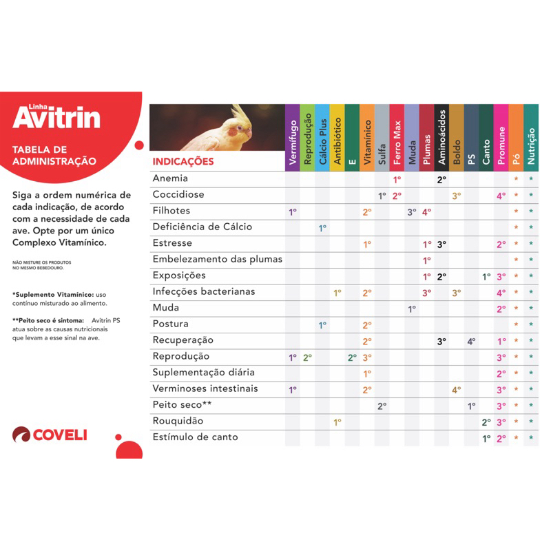 Alcance o máximo de vitalidade e saúde para suas aves com o Complexo Vitamínico Coveli Avitrin! Sabemos o quanto é importante cuidar dos nossos amiguinhos emplumados, e com o Avitrin, você terá um aliado poderoso para manter suas aves sempre cheias de energia e bem-estar. Nossa fórmula exclusiva foi desenvolvida por especialistas e contém todas as vitaminas essenciais para fortalecer o sistema imunológico, melhorar o funcionamento do metabolismo e garantir uma plumagem vibrante e radiante Com o Complexo Vitamínico Coveli Avitrin, suas aves terão todos os nutrientes necessários para manter a saúde em dia. Sua composição balanceada é ideal para prevenir e tratar carências nutricionais, proporcionando uma vida saudável e longa para seus companheiros de penas. Além disso, o Avitrin é extremamente fácil de administrar. Basta adicionar a quantidade recomendada de gotas na água ou no alimento das aves, seguindo as instruções de uso. Com a praticidade e eficácia desse produto, você não terá mais desculpas para não cuidar bem de seus bichinhos. Não deixe de fornecer o melhor para suas aves! Adquira agora mesmo o Complexo Vitamínico Coveli Avitrin para Aves e garanta a saúde e o bem-estar de seus animais de estimação. Posologia: 5 gotas diluídas em 50mL de água a cada 24 hora.