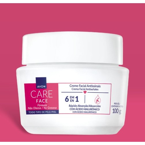 O Avon Care Creme Facial Antissinais 6 em 1 oferece cuidado completo para quem busca hidratação intensa e combate aos sinais da idade em um só passo. Sua fórmula leve e de rápida absorção ajuda a preencher, firmar e reduzir a aparência de rugas e linhas finas, mantendo a pele hidratada por até 24 horas. Dermatologicamente testado e não comedogênico, é indicado para todos os tipos de pele, proporcionando um toque suave, textura uniforme e aparência mais jovem sem oleosidade ou obstrução dos poros. 1 – Reduz a aparência de linhas de expressão 2 – Sensação de maior firmeza e elasticidade 3 – Tem ação antioxidante que protege a pele 4 – Hidrata por até 24h. 5 – Melhora a textura da pele. e mais… – Fórmula não oleosa – Rápida absorção – Com Ácido Hialurônico Dicas de uso: Depois de limpar a pele, passe suavemente o produto no rosto e pescoço em movimentos para cima e para fora. Conteúdo: 100g