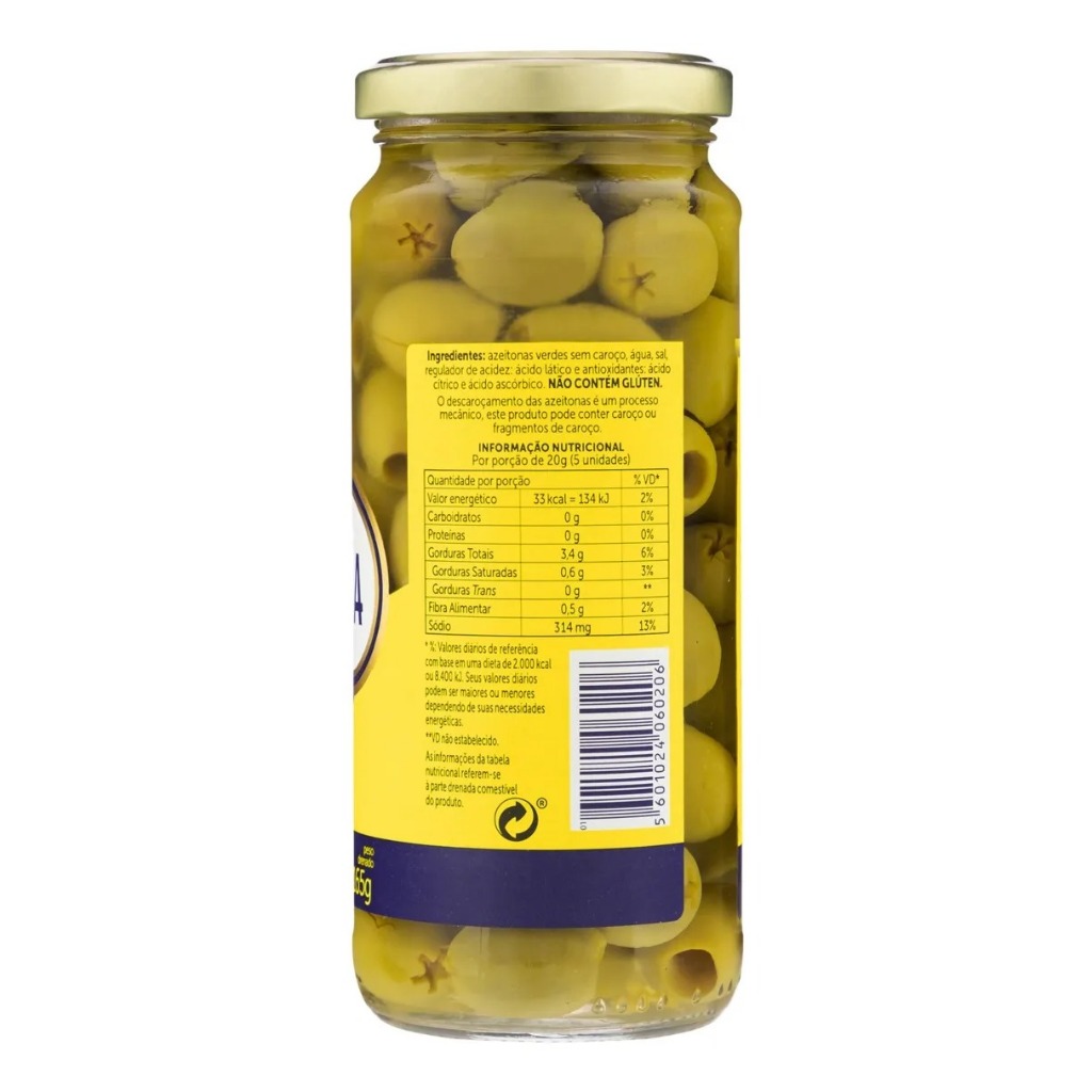 🧾 Descrição do Produto: Azeitona Verde sem Caroço Andorinha 165g – Praticidade e Sabor no Seu Dia a Dia A Azeitona Verde sem Caroço Andorinha 165g é perfeita para quem busca praticidade sem abrir mão do sabor. Já sem caroço, é ideal para receitas, petiscos, saladas e acompanhamentos. Produzida com azeitonas selecionadas e conservadas com cuidado, entrega sabor suave, textura firme e qualidade garantida pela tradição da marca Andorinha. ✅ Benefícios: Azeitonas verdes sem caroço Peso líquido: 165g Sabor suave e textura firme Prontas para consumo Mais praticidade no preparo de receitas Produto importado de Portugal Marca Andorinha – tradição desde 1927 🍽️ Sugestão de uso: Perfeitas para saladas, pizzas, massas, recheios, petiscos e tábuas de frios.