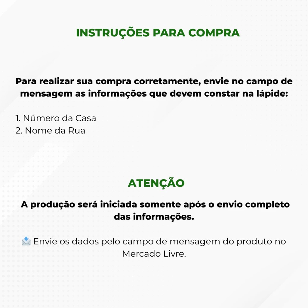 Deixe a fachada da sua casa mais bonita, organizada e cheia de personalidade com nosso azulejo personalizado. Ideal para identificação residencial, combinando decoração e funcionalidade em um só produto. 📐 Tamanho: 20 x 20 cm 🏺 Material: Azulejo cerâmico de alta qualidade 🎨 Personalização: Número da casa e nome da rua conforme solicitado ✨ Acabamento: Impressão nítida, cores vivas e excelente definição 🏠 Uso indicado: Fachadas, muros, portões e áreas externas cobertas 💡 Produzido com cuidado para garantir um visual elegante e durável, valorizando a entrada do seu imóvel. 📩 Como personalizar: Após a compra, envie pelo chat: Número da residência Nome da rua (Se desejar) preferência de estilo ou cor 🛒 Produto feito sob medida para você. Garanta já o seu e dê um toque especial à sua casa!