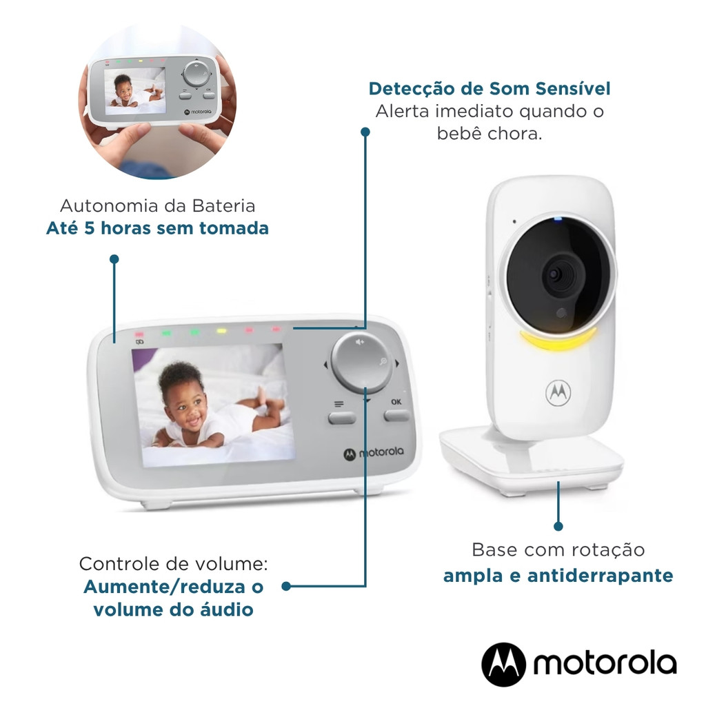 Babá Eletrônica VM482ANXL Monitor LCD 2.8 Câmera com Iluminação de Ambiente Visão Noturna e zoom Digital Motorola - BIVOLT Mantenha-se sempre próxima do seu bebê com a Babá Eletrônica Motorola VM482ANXL, a escolha ideal para quem busca segurança, conforto e praticidade no dia a dia. Com uma tela colorida de 2,8 polegadas, você acompanha cada movimento do seu pequeno com imagens nítidas e detalhadas, enquanto a visão noturna infravermelha garante uma visualização perfeita mesmo no escuro. Com conexão privada e segura, a babá eletrônica dispensa Wi-Fi e aplicativos, utilizando a tecnologia FHSS de 2,4 GHz, que garante transmissão criptografada e impede qualquer tipo de acesso externo. Assim, você tem a tranquilidade de saber que apenas você pode ver e ouvir seu bebê. A câmera com iluminação ambiente multicolorida cria uma atmosfera calma e aconchegante, perfeita para ajudar o bebê a relaxar durante o sono. São 7 cores suaves e níveis de brilho ajustáveis, que tornam o quarto mais acolhedor. Além disso, o monitoramento da temperatura ambiente permite que você saiba sempre se o ambiente está na faixa ideal de conforto para o seu filho. Com alcance de até 305 metros, a Babá Eletrônica Motorola VM482ANXL oferece liberdade total para se movimentar pela casa enquanto permanece conectada ao seu bebê. O microfone de alta sensibilidade capta até os sons mais sutis, e o indicador de nível de som em LED garante que você perceba qualquer movimentação, mesmo quando o volume está baixo. Elegante, funcional e moderna, a Babá Eletrônica Motorola VM482ANXL é o parceiro perfeito para noites tranquilas e dias mais leves, oferecendo monitoramento seguro, tecnologia confiável e toda a tranquilidade que os pais merecem. Principais Características: - Tela colorida LCD de 2,8" resolução de aproximadamente 320 × 240 px para visualização nítida e detalhada. -ACOMPANHA FONTE/CARREGADO BIVOLT - Visão noturna infravermelha que permite enxergar claramente o bebê mesmo em ambientes escuros. - Zoom digital e ajuste manual de panorâmica e inclinação para melhor enquadramento da câmera. - Sem necessidade de Wi-Fi ou aplicativos, garantindo simplicidade e segurança. - Tecnologia FHSS 2,4 GHz com transmissão criptografada — apenas você pode ver e ouvir o bebê. - Conexão direta entre câmera e monitor, sem risco de interferências externas. - Luz ambiente “mood light” multicolorida com 7 cores e níveis de brilho alto/baixo. - Cria um ambiente relaxante e acolhedor, ajudando o bebê a dormir mais tranquilo. - Sensor de temperatura ambiente que indica se o quarto está quente ou frio demais. - Indicador LED de nível de som para acompanhar ruídos mesmo com o volume baixo. - Microfone sensível que capta até os sons mais suaves. - Alcance de até 300m (Este valor é em linha de visada ideal. Paredes, obstáculos, interferência podem reduzir o alcance). - Transmissão de vídeo e áudio em tempo real, sem atrasos. - Design moderno e compacto, fácil de posicionar e combinar com o ambiente. Especificações Técnicas: - Conteúdo da Embalagem: 1 Aparelho dos Pais Tela LCD 2,8 Polegadas, 1 Câmera, 1 Adaptador de energia (Padrão americano) + Manual de Instruções. - Garantia: 12 Meses (Contra Defeito de Fabricação Pelo Fabricante) - Certificação: Homologação ANATEL 14620-21-08069 - Referência do Fabricante: VM482ANXL - EAN: 810036771214 - Marca: Motorola Imagens meramente ilustrativas, as cores e estampas podem variar de acordo com o lote do fabricante.