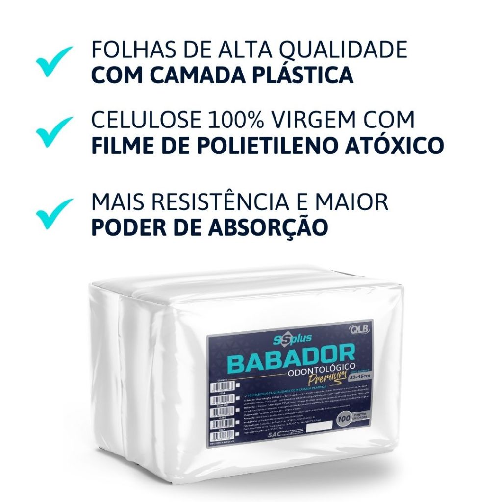 📝 DESCRIÇÃO O Babador Odontológico Premium Ssplus é ideal para clínicas, consultórios e profissionais da área da saúde que buscam máxima proteção, higiene e conforto para seus pacientes. Produzido com folhas de alta qualidade, possui camada plástica impermeável que evita vazamentos, garantindo segurança durante os atendimentos. Fabricado em celulose 100% virgem com filme de polietileno atóxico, oferece maior resistência e excelente poder de absorção, mantendo o ambiente limpo e profissional. ✅ PRINCIPAIS BENEFÍCIOS ✔ Folhas de alta qualidade com camada plástica ✔ Celulose 100% virgem com filme de polietileno atóxico ✔ Mais resistência e maior poder de absorção ✔ Evita vazamentos e contaminações ✔ Ideal para clínicas odontológicas e estéticas 📦 ESPECIFICAÇÕES • Produto: Babador Odontológico Premium • Marca: Ssplus • Tamanho: 33cm x 45cm • Material: Celulose + Filme Plástico Impermeável • Quantidade: 100 unidades • Uso: Odontológico, clínico e estético