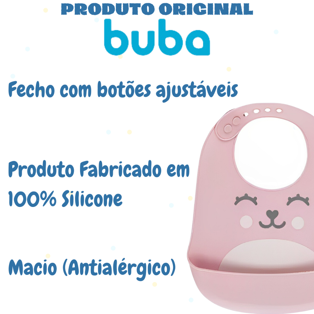 BABADOR PEGA MIGALHAS BUBA PRODUTO ORIGINAL A PRONTA ENTREGA O babador de silicone Gumy da Buba é super prático e higiênico. Possui bolso pega migalhas, ideal para proteger a roupinha do bebê. O fecho com botões se ajusta facilmente ao pescoço do pequeno.Especificações:Idade: Para crianças acima de 3 mesesComposição: 100% SiliconeProduto livre de BPA e ftalatosPode ir à lava-louças.Retirar da embalagem antes de oferecer a criançaUsar sempre sob a supervisão de um adulto Fecho com botões ajustáveis Altura; 28cm Largura: 23cm Profundidade: 2cm MARCA BUBA São quase duas décadas participando do crescimento saudável e seguro de milhares de crianças. Desde então, trabalhamos para potencializar o desenvolvimento infantil nas diferentes fases, estimulando percepções, sentidos e habilidades. Para nós, brincar vai além de divertir. São cores, formas, sons e texturas que convidam o bebê a descobrir o mundo enquanto se diverte.