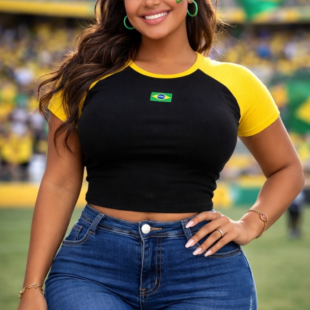 | Cropped Brasil Feminino Torcedora Copa Canelado Bordado Manga Curta... | R$ 24,90 | 58% | 5.0/5 | 3 |