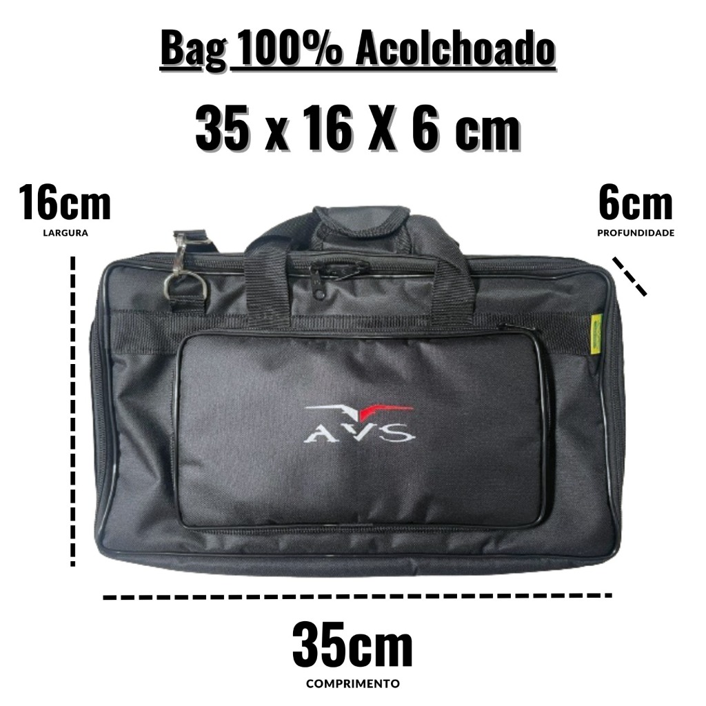 PRODUTO NOVO - LACRADO - POSTAGEM IMEDIATA! * Entrega Segura e Ágil * Total Suporte no Pós-Vendas * Produto Original com Garantia do Fabricante _ Bag capa case para pedaleira Mooer Ge200 e Ge250 ou Similares - Medidas: 35cm x 16cm x 06cm _ ESPECIFICAÇÕES: * Marca: AVS * Modelo: SUPER LUXO (GE200) e (GE250) * Tipo: bag para pedaleira MOOER GE200 e GE250 ou similares * Material: 100% Acolchoado com Isomanta, material térmico. * Cor: Preto _ CARACTERÍSTICAS: * 01 Alça tira colo (Estilo Maleta); * 01 Alça (dupla) de mão em fita; * Bolso frontal para acessórios * Tecido nylon 600; * Forro nylon 70 resinado; * Ziper 8 para abertura lateral e Ziper 6 para abertura do bolso; _ * Bag acolchoado, tecido série nylon 600 com forro nylon 70 resinado, acolchoada com isomanta (EPE Espuma de Polietileno Expandido) de 10mm. * A isomanta é térmica, ajuda a proteger do calor e tem uma densidade maior que as espumas convencionais, isso irá garantir ainda mais proteção a sua pedaleira. _ MEDIDAS: Medidas: Comprimento: 35 cm, Largura: 16 cm, Profundidade: 6 cm Medidas bolso externo: 25 cm x 10 cm _ ESPECIFICAÇÕES: * Espuma: Isomanta (EPE Espuma de Polietileno Expandido) de 10mm, térmica. * Tecido externo: Série nylon 600 * Forro: Nylon 70 resinado * Fabricante: World Bags AVS * Fabricado no Brasil _ GARANTIA: * 90 dias contra defeitos de fabricação. _ ITENS INCLUSOS NA EMBALAGEM: * 01 Bag para pedaleira Mooer Ge 200 e Ge250 ou Similares - Avs - Linha Super Luxo _ OUTRAS INFORMAÇÕES: * Produto novo, original, com nota fiscal e garantia de 90 dias contra defeitos de fabricação. _ * Postaremos o produto em até 24hrs após confirmação de pagamento. * Qualquer dúvida ficaremos contentes em responder. * Boas compras e volte sempre!