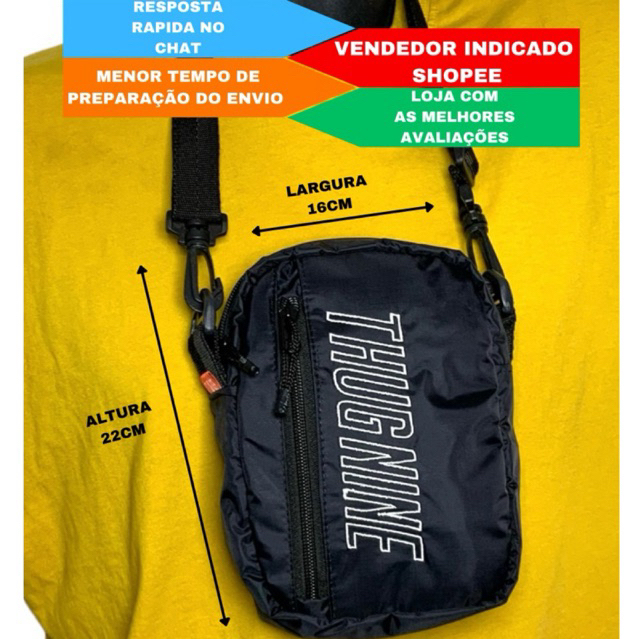 Bag lateral thug nine premium street wear top! Fabricada em nylon 70 resistente à água, contém 3 compartimentos, alça cce que simula cinto de segurança regulável e removível com mosquetões giratórios, zipers invertidos, logo frontal bordado em alto relevo em Patch aplique direto na peça, cordinhas com ponteiras nos puxadores. Todas nossas shoulder bags, pochetes, bolsas laterais são únicas no mercado, somos fabricantes exclusivos. São usados matéria prima de alta qualidade e o melhor preço do mercado. aguardo sua compra, obrigado!