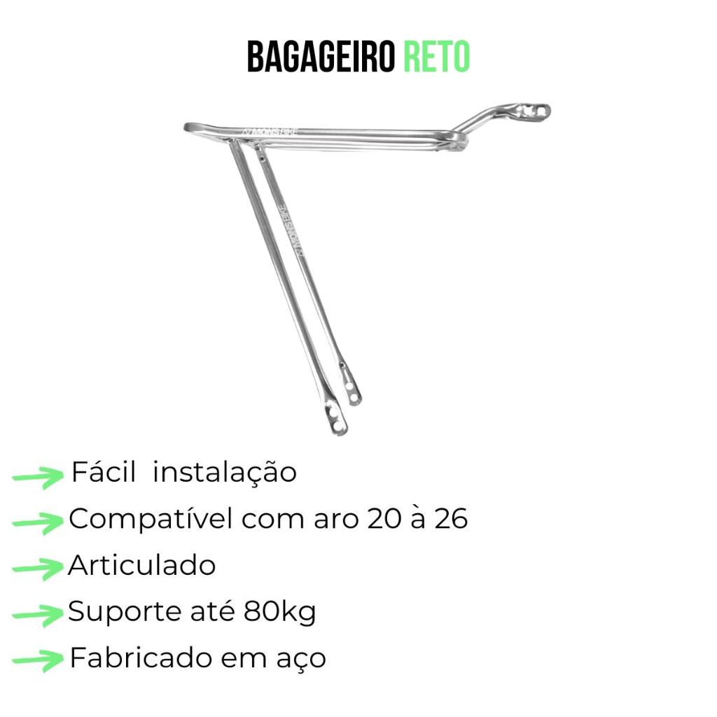 **ATENÇÃO! NÃO SERÁ ENVIADO O MODELO ANTIGO!** Garupa Bagageiro Tubular de Aco Cromada Aro 20 24 e 26 Bagageiro de bicicleta em aco tubular modelo articulado e de instalacao para bikes de aro 20 a aro 26, suporta ate 80kg e possui fixacao no eixo da roda traseira e abracadeira do canote do selim. Este modelo e compativel com cadeiras de crianca traseiras tipo Kalf (sistema de fixacao por presilhas). Especificações: -Comprimento: 44cm -Largura: 17cm -Peso: 940g -Material: Aco -Cor: Cromado -Capacidade: 80kg Aviso: -Verifique se ha espaco suficiente no eixo e no parafuso de aperto da abracadeira do selim, os mesmos devem ter uma sobra de 5mm na rosca, que e a espessura da chapa do bagageiro nos pontos de fixacao. -Este bagageiro possui fixacao no eixo da roda traseira e abracadeira do canote de selim. Por isso nao recomendamos o uso em bicicletas com blocagens (quick releases ou aperto rapido) pois dificultam o aperto podendo causar um acidente, recomendamos o uso de eixos e parafusos com porcas para fixacao deste bagageiro. -Este bagageiro nao serve em bicicletas com freio a disco pois o caliper (ou pinca do freio) impede a instalacao do mesmo. -Recomendamos a instalacao em uma oficina mecanica de confianca.