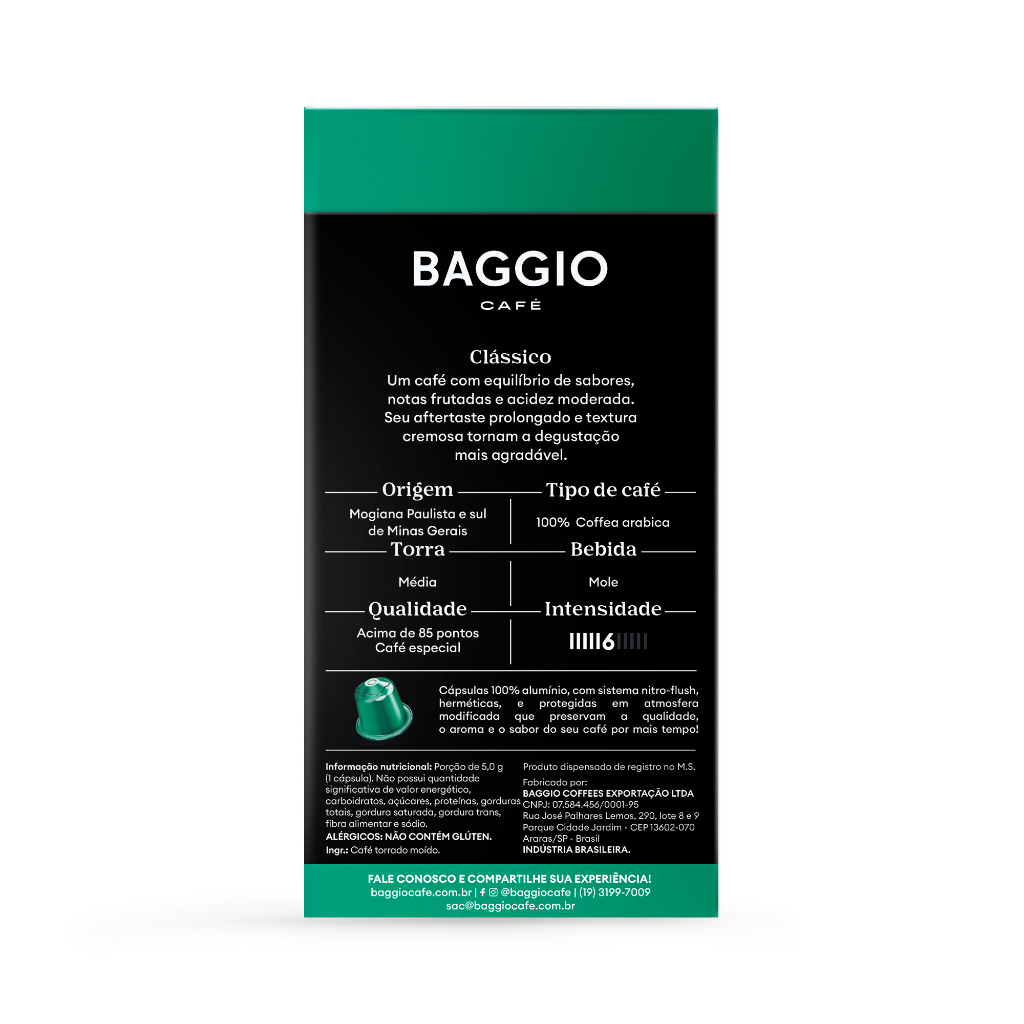O café Baggio Clássico tem equilíbrio de sabores, notas frutadas e acidez moderada. O aftertaste prolongado é uma característica marcante, oferecendo uma sensação gustativa única e saborosa. Ao degustar o Clássico, é possível perceber a sua textura cremosa, que preenche o paladar com uma sensação agradável e saborosa. A acidez moderada é um dos principais destaques desse café, uma vez que ela equilibra os demais sabores e torna a experiência de degustação mais agradável. As cápsulas são de alumínio e compatíveis com as máquinas: Nespresso®: Essenza C90, Maestria, Citiz, U, Inissia, Prodigi, Pixie, Lattissima Touch, Lattissima Pro, Expert e Essenza Mini. Exceto modelos Vertuo.