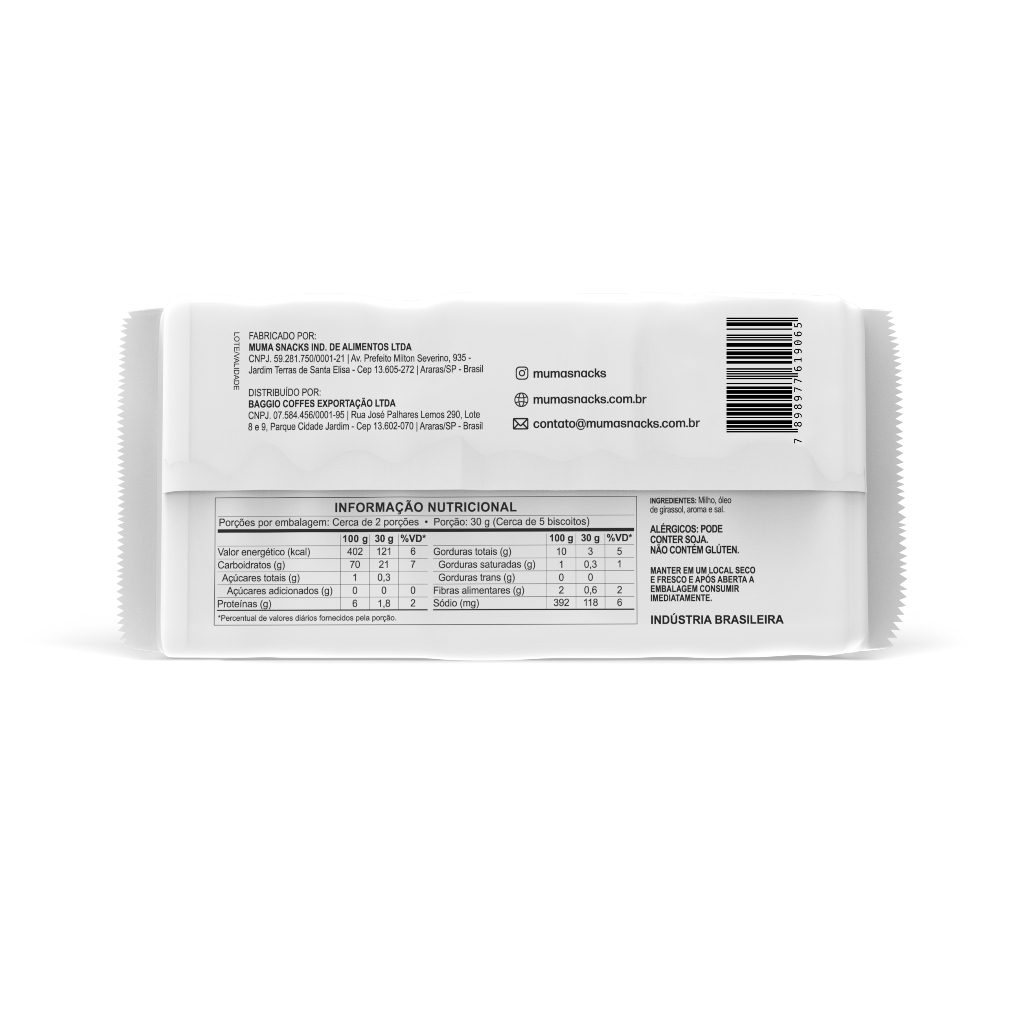 Descubra a Muma Snacks, o biscoito de milho que faz croc-croc de verdade! Feito de milho com ervas finas e um toque de azeite, é leve, crocante e cheio de personalidade. Nada de fritura, nada de culpa — só ingredientes de verdade e muito sabor. Perfeito pra qualquer hora do dia! Muma Snacks: Sua escolha leve, crocante e saudável. Ingredientes: Milho, óleo de girassol, aroma e sal. Pacote com 10 biscoitos. ALÉRGICOS: PODE CONTER SOJA. NÃO CONTÉM GLÚTEN.