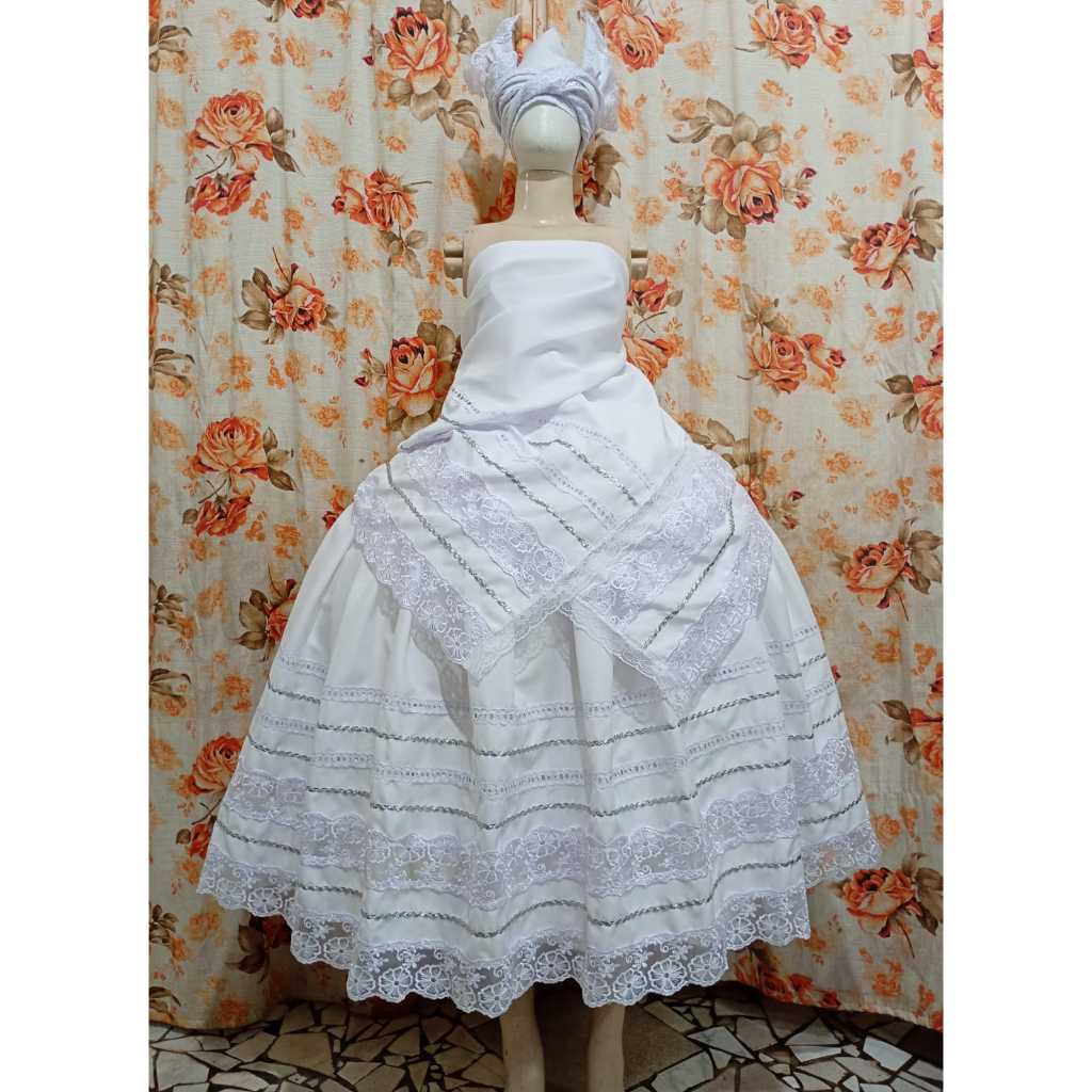 Baiana Luxo 3 peças - Branco e Prata 1 saia de 3,5 metros por 0,90 cm 1 pano da costa 1,80 metros por 0,80 cm 1 pano de cabeça de 2,50 comprimento por 0,35 cm - Ponto palito - Renda - sianinha prata Obs. Pode ocorrer troca de material caso o estoque tenha acabado...