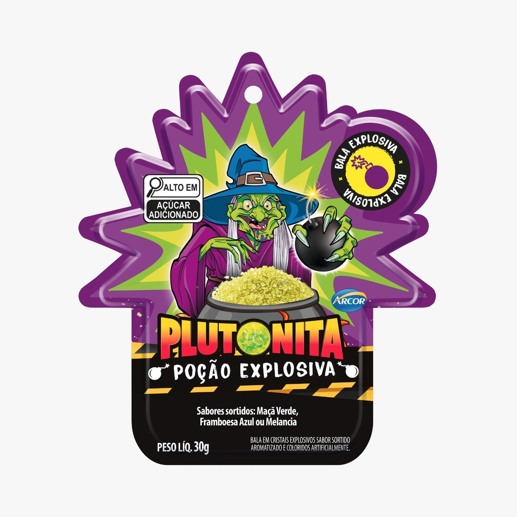 Bala Plutonita Poção Explosiva Cristais explosivos de bala dura, sabores artificiais de framboesa azul, maçã verde e melancia. Ingredientes: Açúcar, lactose, xarope de maltose, regulador de acidez málico (DL-), aromatizantes, conservantes de dióxido de carbono e corantes: vermelho allura AC (E129/INS 129), sais de potássio e sódio de clorofilina cúprica (E141/INS 141(ii)) e azul brilhante FCF (E133/INS 133). Alérgicos: Contém derivados de leite. Contém lacotse. Não contém glúten. Industria Chinesa. Contém 15 unidades de 2g Peso liquido 30g