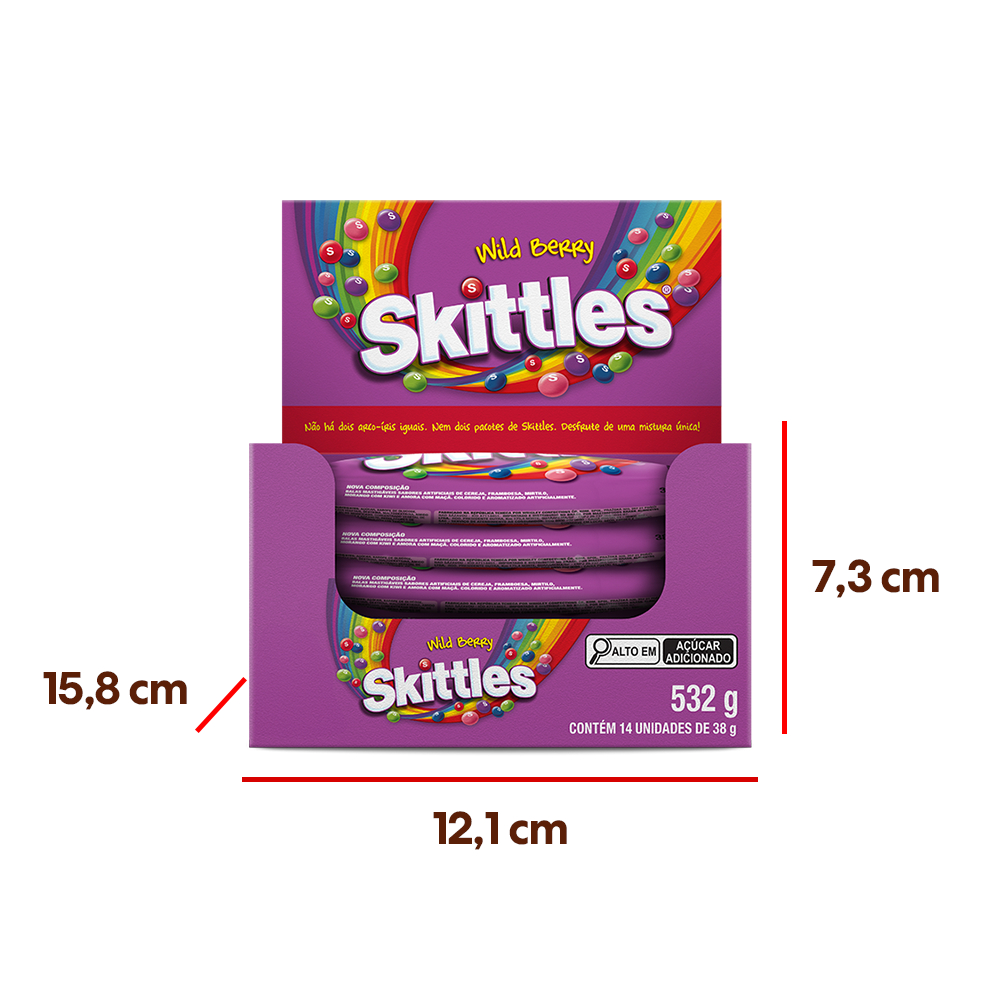 Caixa com 14 unidades da Bala Skittles Wild Berry 38g. Cada pacote de Skittles Wild Berry 38g dá a oportunidade de provar o arco-íris, com uma variedade de sabores de fruta surpreendente. Os sabores incluem framboesa, cereja, amora com maçã, mirtilo e morango com kiwi. Experimente também o sabor Original. INGREDIENTES: Açúcar, xarope de glicose, óleo de palma, dextrina, maltodextrina, amido de milho modificado, concentrado vegetal de batata doce, rabanete e framboesa, acidulante: ácido cítrico, corantes: vermelho de beterraba, dióxido de titânio, beta-caroteno, carmim, cúrcuma e azul brilhante fcf, aromatizantes, regulador de acidez: citrato de sódio, glaceante: cera de carnaúba e emulsificante: lecitina de girassol. ALÉRGICOS: CONTÉM GLUTEM, AROMATIZANTE ARTIFICIAL E DERIVADOS DE TRIGO.