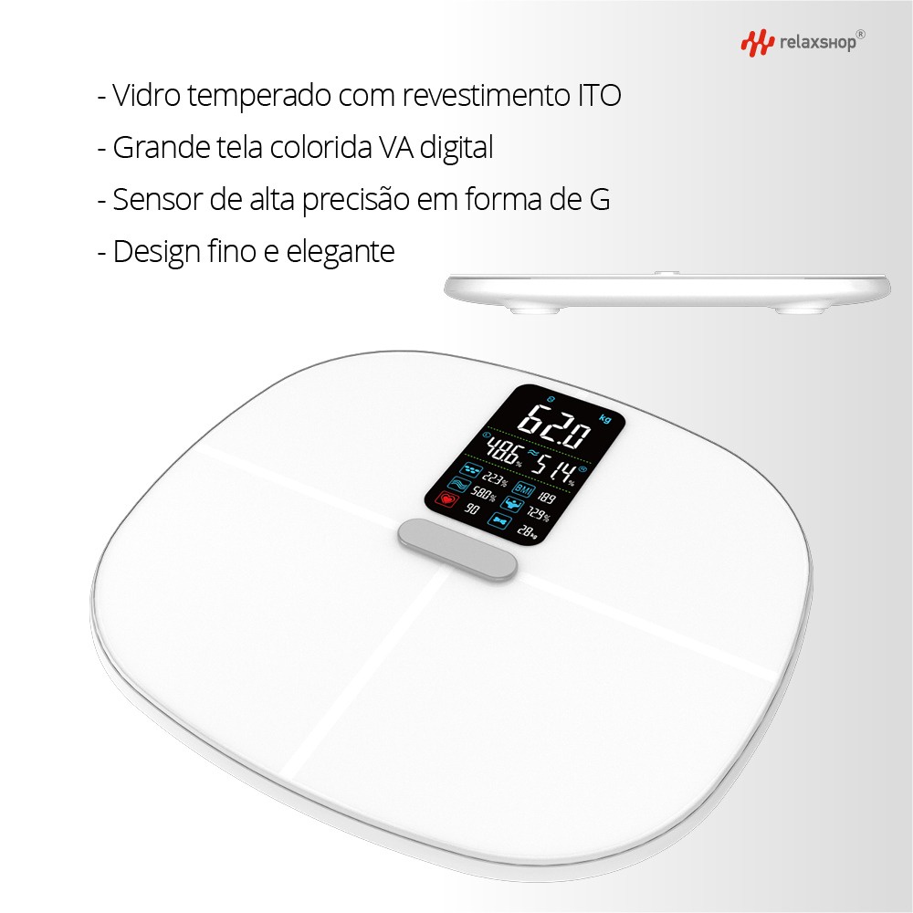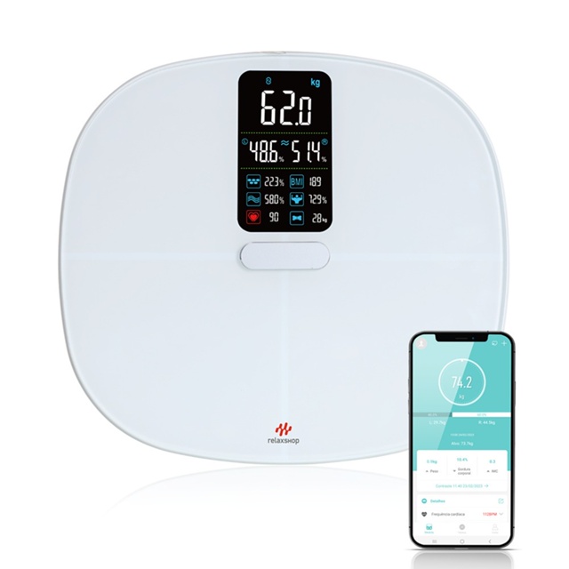 Com design sofisticado e tecnologia inteligente a Relaxshop lança a Balança Bio Plus Branca para te ajudar a acompanhar diariamente as suas medidas de maneira que você possa controlar seu histórico corporal. Com 4 sensores na balança que medem detalhadamente os dados como a frequência e o índice cardíaco e auxiliando no controle de peso. Indicada para medição: - Taxa de gordura corporal; - Dados IMC; - Frequência cardíaca; - Taxa muscular esquelética; - Massa muscular; - Massa óssea; - Rastreamento do equilíbrio corporal; - Taxa metabólica basal; - Gordura subcutânea; - Idade do corpo; - Água corporal; - Gordura visceral. Diferenciais: - Sistema inteligente e desligamento automático; - Conexão com aparelhos IOS E Android via Wireless; - Sem limites de contas cadastradas; - Vidro temperado; - Visor LCD; - Relatório de frequência cardíaca. Dados técnicos: Dimensão: 30X27X2,1cm Dimensão da tela: 6,2X10,3cm Peso: 1,300Kg Forma de usar: 4 pilhas AAA Frequência: 50-60Hz Cor: Branca Capacidade: 180Kg (máximo)