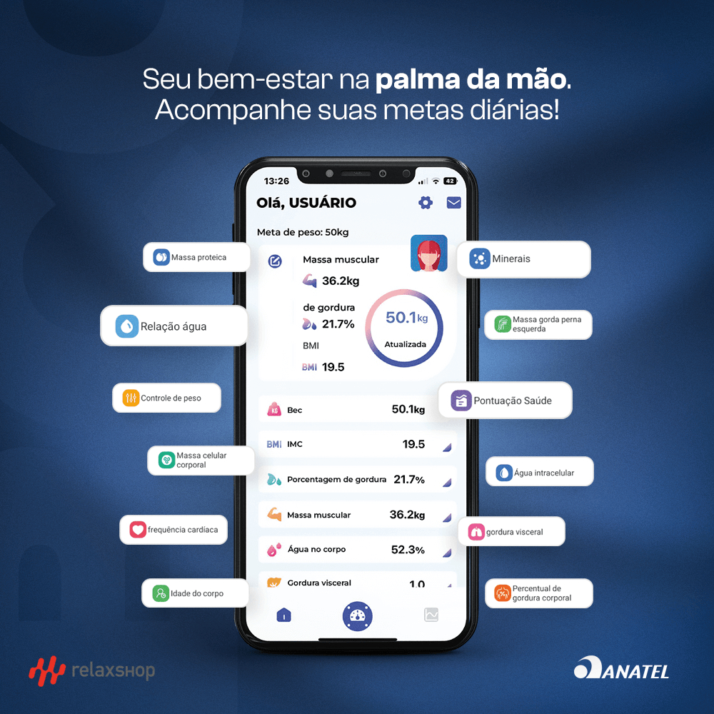 BALANÇA BIOIMPEDÂNCIA BIO ULTRA faz 55 Analise Corporal a única no BRASIL. MODELO: 2024/2025 A Relaxshop lança a Balança Bioimpedância Bio Ultra para te ajudar a acompanhar as informações do seu corpo diariamente. Um aparelho de alta precisão que faz uma análise completa das suas medidas com relatório para que você cuide da sua saúde. Com 8 eletrodos de metal que são distribuídos nos pés e na barra de mãos, para medir de forma sincronizados os membros inferiores e superiores facilitando o acompanhamento do seu processo corporal visando a saúde e o equilíbrio. Indicado para: Indicada para medição: - Peso - BMR - Idade Corporal - Frequência Cardíaca - IMC - Água Corporal total - Porcentual de gordura corporal - Taxa muscular do tronco - Pontuação Saúde - Frequência muscular do pés direito - Controle de peso - Massa livre de gordura - Peso padrão - Gordura Visceral - Minerais - Água extracelular - Massa muscuclar esquelética - Adiposty nível - Controle muscular - Água intracelular - Nível de obesidade - Ingestão calorica recomendada - Massa óssea - Tipo de corpo - Avaliação sanitária - Massa celular - Relação cintura-quadril - Indice qualidade muscular esquelética - Controle gordo - Massa Gorda - Massa Muscular - Massa Proteica - Massa gorda perna direita - Massa muscular perna direita - Massa gorda perna esquerdo - Massa muscular perna esquerdo - Massa gorda do tronco - Massa muscular do tronco - Massa gordura subcutânea - Massa muscular do braço esquerdo - Rácio gordura perna direita - Relação gordura subcutânea - Relação gorda do braço esquerdo - Relação gorda do braço direito - Relação gorda - Proporção muscular - Relação proteica - Relação Água Diferenciais: - Balança a bateira recarregável - 8 eletrodos de metal para medição; - Conexão com aparelhos IOS e Android via Bluetooth e WIFI; - Modo bebê, que permite pesar bebês no colo dos pais; - Vidro temperado. - Medição BIA, mais precisa. - Forma de usar: Bateria interna recarregável Dados técnicos: - Conectividade: Bluetooth e Wifi - Tamanho da Balança: 35 x 33 x 3 cm - Tamanho da tela do visor é 81,5 x 53,5 mm (tela grande) com ajuste de brilho. - Capacidade: 180kg - Vidro temperado de 6mm. - Marca: Relaxshop - Garantia: 12 meses - Cor: Preta - Frequência: 50-60 Hz - Cabo: USB e Carregador - Manual em Português ITENS INCLUSO 1 - Balança Bio Ultra (modelo: ano 2024/2025) 1 - Cabo USB 1 - Carregador 1 - Manual de instrução