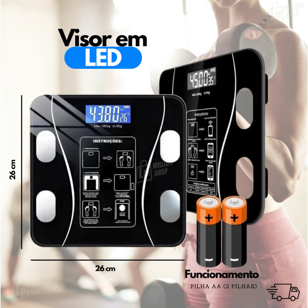 Aprenda mais sobre seu corpo e melhore sua performance diariamente. Você terá dados precisos sobre seu corpo e a partir deles saberá exatamente o que precisa ser melhorado através do aplicativo OKOK-INTERNACIONAL (disponível para IOS e Android) Você acompanha de perto a evolução da sua saúde comparando com os registros anteriores Monitore os seguintes indicativos para alcançar seus objetivos: Peso, IMC, Gordura, Registro de Massa Muscular, Água, Gordura Visceral, Ossos, Metabolismo, Proteína, Obesidade, Idade Corporal e LBM CARACTERISTICAS * Capacidade máxima de 140kg. * Registra até 4 perfis. * Com conexão Bluetooth. * Mede o índice de massa corporal (IMC) e a gordura. * Pode ser sincronizada com um telefone celular. * Possui display digital. * Plataforma antiderrapante de vidro. * Funciona com pilhas. * Se desliga automaticamente. * Acionamento automático, apenas subir para ligar * Display em Led Iluminada * Ultra Fina, Compacta e Bonita * Vidro Temperado e Elegante * Unidades: Kg / Lb * Indicação de carga da bateria * Utiliza 2 Pilhas AAA (não inclusas)