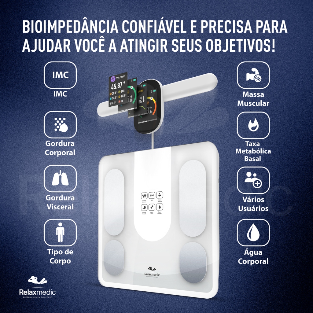 CERTIFICAÇÃO ANATEL Nº 00983-25-17580 Balança Bodyscan Vision BENEFÍCIOS - PESAGEM CORPORAL, soma de todos os componentes da constituição física: água, músculos, ossos e gordura de forma confiável e precisa; - Descobrir o percentual de GORDURA CORPORAL (células de gordura distribuídas no organismo e localizadas sob a pele). Manter a quantidade de gordura corporal dentro dos valores ideais é importante para garantir a saúde e proteger os órgãos internos; - A GORDURA VISCERAL é o tipo de gordura que se acumula na cavidade abdominal e está associada a um maior risco de doenças como doenças cardíacas, diabetes tipo 2 e câncer; - A GORDURA SUBCUTÂNEA é o tipo de gordura que se acumula logo abaixo da pele, em áreas como barriga, quadris, coxas e braços. Embora seja normal ter certa quantidade de gordura subcutânea, o excesso desse tipo de gordura pode estar relacionado a problemas de saúde, como obesidade, resistência à insulina e doenças cardiovasculares; - Saber se você está suficientemente hidratado através do percentual de ÁGUA CORPORAL. O nosso corpo pode ter de 50% a 65% de água. Índices baixos de hidratação podem indicar que mais líquidos devem ser ingeridos; - Descobrir o seu percentual de MASSA MUSCULAR, que compreende toda estrutura formada por músculos em nosso corpo. Fazer este acompanhamento a longo prazo é importante para manter a mobilidade e o equilíbrio; - Acompanhar o seu índice de MASSA ÓSSEA (conteúdo mineral dos ossos). Importante percepção porque, ao longo dos anos, pode haver redução do tecido ósseo e, com isso, maior probabilidade de desenvolver doenças como a osteoporose; - Saber a quantidade de PROTEÍNA no corpo é importante porque ajuda a identificar deficiências ou excessos que podem afetar o funcionamento adequado do organismo. As proteínas desempenham funções vitais, como a construção e manutenção de tecidos e órgãos, regulação celular, funcionamento do sistema imunológico e transporte de nutrientes. - Descobrir quantas calorias você gasta diariamente, com o seu organismo em repouso, através do apontamento da TMB - TAXA METABÓLICA BASAL (Kcal). Assim, ficará mais fácil planejar a sua alimentação e atividade física para atingir seus objetivos; - Calcular o seu ÍNDICE DE MASSA CORPORAL (IMC), dividindo o seu peso (em kg) pela sua altura (em metros) ao quadrado. É o parâmetro utilizado pela OMS (Organização Mundial da Saúde) para calcular o peso ideal. Sozinho, não avalia a pessoa integralmente e também não é válido para crianças. - A IDADE CORPORAL é uma estimativa da idade do corpo em relação à idade cronológica. Isso ajuda as pessoas a terem uma noção melhor do seu estado de saúde geral e motiva a adoção de hábitos saudáveis para melhorar ou manter a idade apontada. SOBRE A BALANÇA DIGITAL DE BIOIMPED NCIA BODYSCAN VISION Em vez de se limitar a medir apenas o peso, agora você pode ter uma visão mais completa e detalhada do seu corpo. A Balança de Bioimpedância Bodyscan Vision da Relaxmedic vai além do básico, analisando a composição corporal de maneira profunda e precisa. Com a Bodyscan Vision, você pode monitorar como seu corpo responde à dieta e aos exercícios, ajustando suas rotinas para alcançar resultados mais eficazes e duradouros. Seja no início de uma jornada de emagrecimento ou buscando melhorar sua performance, essa balança é uma aliada poderosa, oferecendo uma visão completa e detalhada do seu corpo, devido à sua alta tecnologia e dupla frequência de medição. - Acompanhe todos os detalhes do seu corpo diretamente no seu celular Graças à conexão via Bluetooth, todos os seus dados de bioimpedância são sincronizados com seu smartphone, permitindo que você monitore seu progresso ao longo do tempo. O aplicativo é compatível com Android e iOS, facilitando o acompanhamento dos dados e do histórico das medições, onde quer que você esteja. - Tecnologia e precisão ao seu alcance VANTAGENS DESTE APARELHO • Todos os dados disponíveis no APP Fitdays; • Pode ser sincronizada a um telefone celular iOS ou Android com conexão via Bluetooth; • Possui 8 sensores de alta precisão para fazer a leitura de bioimpedância; • Capacidade máxima de até 180kg; • Divisão de 10g; • Possui tela TFT, uma versão mais nítida e sofisticada do painel LCD, que facilita a visualização rápida; • Visor colorido com iluminação própria para melhor visualização dos dados; • Fio retrátil; • Memória para diversos usuários; • Contém armazenamento off-line, com memória do perfil do usuário; • Função para pesar bebê; - Plataforma com 6mm de vidro temperado; • Liga, zera e desliga automaticamente; • Indicação de bateria fraca e de sobrecarga; • Resistente e durável; • Portátil; - TEM GARANTIA? Sim! Um ano de garantia e a marca possui assistência técnica própria, o que facilita o suporte do cliente mesmo que o produto já esteja fora da garantia.