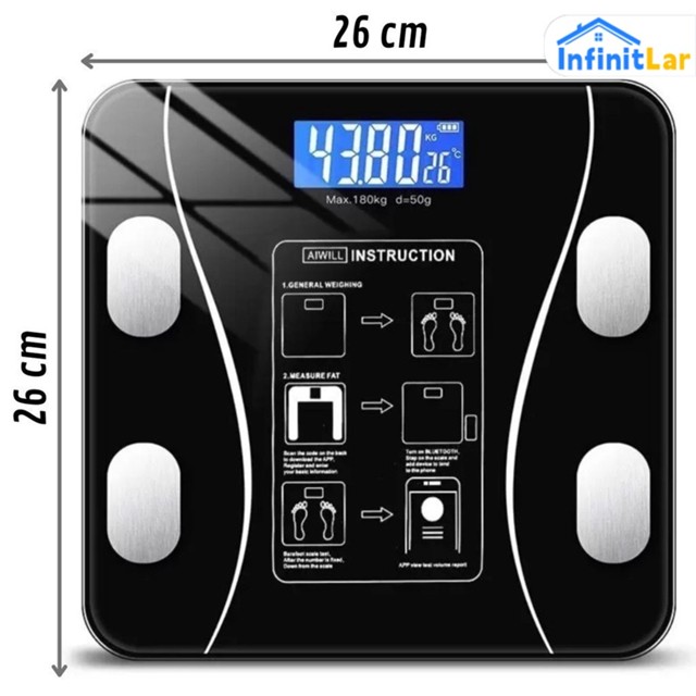 Balança Digital Inteligente Corporal com Bioimpedância e Aplicativo Alcance seus objetivos de saúde com praticidade e tecnologia! A Balança Digital com Bioimpedância é perfeita para quem busca monitorar a saúde e o bem-estar no dia a dia. Além de medir o peso corporal, ela oferece dados completos como IMC, percentual de gordura, massa muscular, massa óssea, percentual de água e metabolismo basal — tudo isso de forma fácil e acessível através do aplicativo conectado via Bluetooth. Acompanhe sua evolução com gráficos e histórico detalhado, diretamente no app. Ideal para uso individual ou familiar, já que armazena os dados de até 8 usuários. Principais Características: Suporta até 180 kg Dados em tempo real via Bluetooth 4.0 Compatível com Android 4.4+ e iOS 7.0+ Alimentação por 2 pilhas AAA Display LCD digital de 4 dígitos Sistema de sensores de alta precisão Ligações automáticas (liga/desliga) Mede: peso, IMC, gordura corporal, água, metabolismo basal, massa óssea e muscular Unidades de medida: kg / lb Armazena dados de até 8 usuários no aplicativo Aviso de sobrecarga e indicador de bateria fraca Aplicativo OKOK Internacional Dimensões: 26 x 26 cm