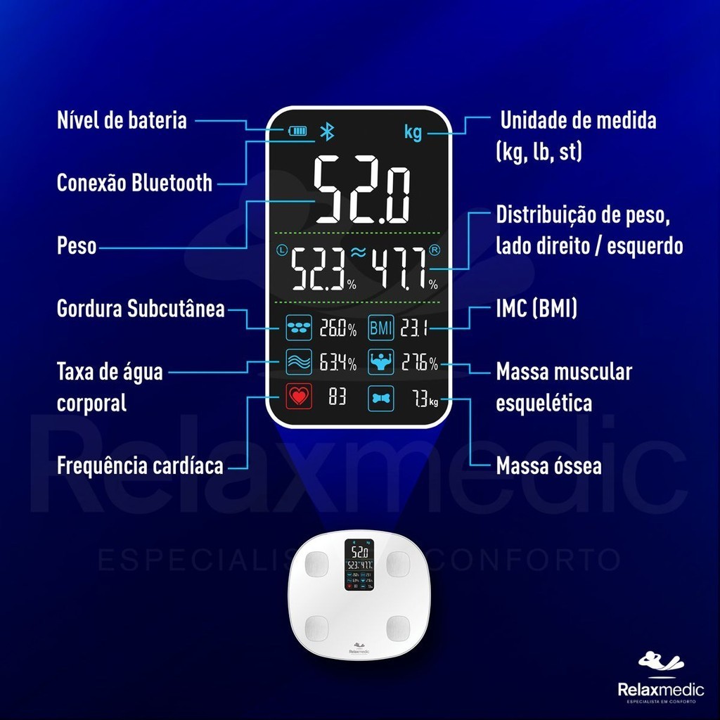 CERTIFICAÇÃO ANATEL Nº 08561-24-17157 ** Com a Balança Digital Cardio App da Relaxmedic você consegue acompanhar diariamente as informações do seu corpo * Com medição de frequência cardíaca e Índice de coração (IC) * Conexão ao aplicativo Fitdays, via Bluetooth compatível com sistemas IOS e Android * Relatório de bioimpedância completo na palma das suas mãos pelo aplicativo Fitdays, podendo ainda ser impresso ou compartilhado * Gráficos comparativos das medições recentes, semanal, mensal ou anual para análise, impressão ou compartilhamento * Sistema inteligente, desligamento automático e indicação de baixa potência e sobrecarga de peso. * Vidro temperado de alta resistência * Memória para até 24 usuários por e-mail cadastrado (sem limite de e-mails cadastrados) * Modo bebê, que permite pesar bebês no colo dos pais * Sincronização com apps: Google Fit, Fitbit, Samsung Health e Apple Health (Saúde) * Limite de peso de 6 a 180kg, com graduação de 100g DADOS DO APLICATIVO - Frequência Cardíaca - Índice de coração - Peso - IMC - Gordura corporal - Taxa muscular - Massa livre de gordura - Gordura Subcutânea - Gordura visceral - Água corporal - Massa muscular esquelética - Massa muscular - Massa óssea - Proteína - TMB - Idade metabólica