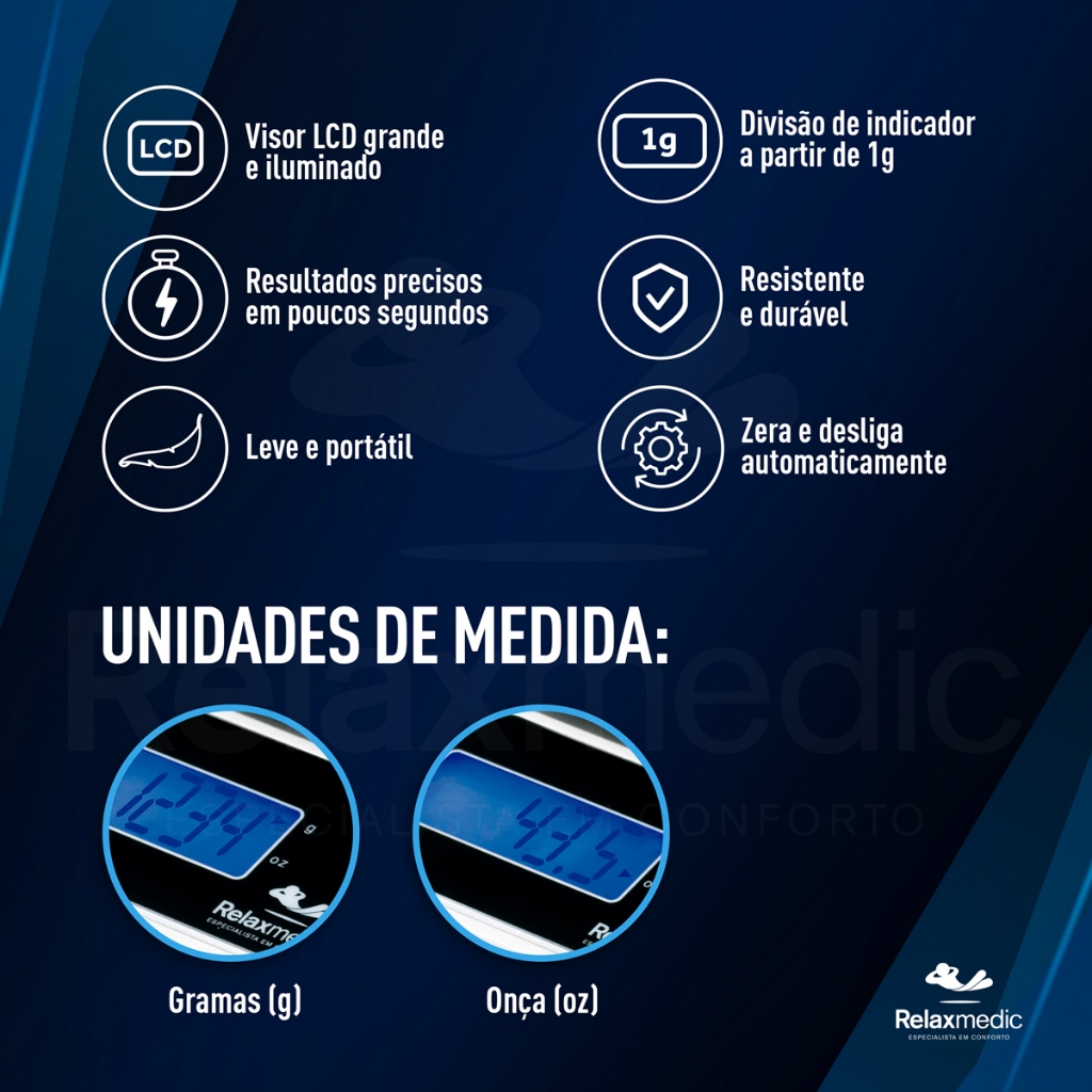 LOJA OFICIAL RELAXMEDIC | PRONTA ENTREGA | COM NOTA FISCAL | TODAS AS FOTOS SÃO REAIS DO PRODUTO | ENVIO PARA TODO BRASIL | MAIS DE 20 ANOS NO MERCADO | 1 ANO DE GARANTIA | ASSISTÊNCIA TÉCNICA PRÓPRIA BENEFÍCIOS - Controle de porções: ao medir com precisão os ingredientes, a balança ajuda na promoção de uma alimentação equilibrada; - Auxilia em esforços para manter ou atingir um peso saudável; - Amplia a consciência alimentar, mais detalhada e informada; - Redução de desperdício, incentivando práticas mais sustentáveis e econômicas na cozinha. SOBRE A BALANÇA DE COZINHA X6 Esta balança é um convite para um estilo de vida mais equilibrado. Ao controlar porções com precisão, você promove uma alimentação consciente, contribuindo para seus esforços em manter um peso saudável. A Balança de Cozinha X6 fornece resultados precisos em poucos segundos garantidos pelos sensores de alta precisão, enquanto o visor LCD grande e iluminado oferece uma visualização clara em qualquer ambiente. Possui a função de Tara em que subtrai o peso do recipiente e foca apenas no conteúdo desejado. Com unidades de medida flexíveis, como gramas e onças, se adaptando às suas preferências. A bandeja de aço inoxidável não só adiciona durabilidade, mas também facilita a limpeza após suas criações culinárias. Além disso, a Balança Digital X6 é amigável ao meio ambiente, incentivando práticas sustentáveis ao evitar o desperdício de ingredientes. Com desligamento automático e com tempo programável, você personaliza o uso enquanto desfruta da praticidade. Leve, portátil e pronta para ser sua companheira na cozinha, a Balança de Cozinha X6 Relaxmedic é a escolha perfeita! VANTAGENS DESTE APARELHO - Sistema com sensores de alta precisão; - Resultados precisos em poucos segundos; - Capacidade máxima de 5kg; - Função Tara que permite medição precisa somente do conteúdo desejado; - Unidades de medida: Gramas (g) e Onça (oz); - Divisão de indicador: a partir de 1g; - Visor LCD grande iluminado para fácil visualização dos números; - Zera e desliga automaticamente; - Desligamento com tempo programável: 30s/ 60s/ 120s/ 600s - Bandeja de aço inoxidável; - Leve e portátil; - Conteúdo da embalagem: 1 balança e 1 manual do usuário. FICHA TÉCNICA NOME DO PRODUTO: Balança de Cozinha X6 MARCA: Relaxmedic MODELO: RM-BD6000A CAPACIDADE: Até 5 kg PESO DO PRODUTO: 0,280 kg DIVISÃO DE GRADUÇÃO: 1g UNIDADES DE MEDIDA: Gramas (g) e Onça (oz) VISOR: LCD com luz de fundo ALIMENTAÇÃO: 2 pilhas AAA (não inclusas) DIMENSÕES: 20 x 14,5 x 3,5 cm DIMENSÕES DA BANDEJA: 14 x 14 cm GARANTIA: 12 meses