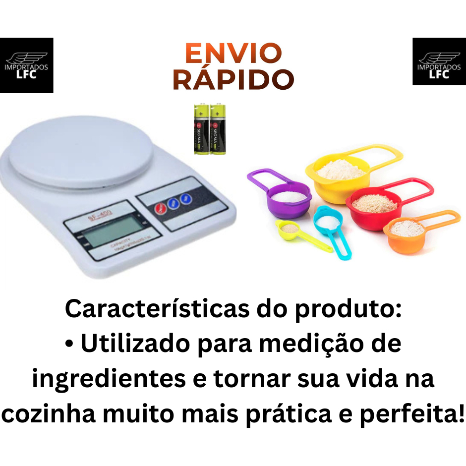 BALANÇA DIGITAL 10kg ALTA PRECISÃO 1g + COLHERES DOSADORAS (UNIDADE OU KIT) RECEITA NUTRIÇÃO + PILHAS JÁ INCLUSAS! Transforme sua Cozinha com o Kit Nutrição Dieta! Você está em busca de praticidade, precisão e um toque de sofisticação na sua alimentação? O Kit Nutrição Dieta é a solução ideal para quem deseja elevar o nível de suas receitas e manter o controle total da dieta, sem complicação. O que você encontra no Kit: Balança Digital de Alta Precisão: Medições exatas de até 10 kg com precisão de 1g. Perfeita para garantir que cada ingrediente esteja na medida certa. 6 Xícaras Medidoras: De 7,5 ml a 250 ml, adaptáveis a todas as suas necessidades culinárias, seja para temperos, massas ou sobremesas. Por que escolher o Kit Nutrição Dieta? Cozinhe com Confiança: Garanta receitas perfeitas e sabores incríveis com as medidas exatas. Menos erros, mais acertos na cozinha! Controle Alimentar Simplificado: Acompanhe com facilidade a ingestão de cada ingrediente e mantenha sua alimentação saudável e equilibrada. Reduza o Desperdício: Com a medição precisa, você elimina sobras desnecessárias e aproveita cada ingrediente. Otimização do Tempo: Menos tempo se preocupando com as medições, mais tempo para experimentar novas receitas e pratos deliciosos! Versatilidade em Cada Detalhe: Prepare desde pães caseiros com a quantidade exata de farinha e água, até temperos perfeitos para suas saladas. O Kit Nutrição Dieta não é apenas para a cozinha, mas também para quem busca otimizar o controle alimentar, seja em dietas específicas ou no planejamento das suas refeições. Especificações Técnicas: Balança Digital: Visor digital claro, precisão de 1g até 10kg e desligamento automático para maior economia de energia. Xícaras Medidoras: Variedade de tamanhos (7,5 ml a 250 ml), para todas as suas receitas e necessidades culinárias. Qualidade e Durabilidade: Material resistente e de fácil manuseio, garantindo segurança e praticidade em cada uso. Transforme a maneira como você cozinha, se alimenta e cuida de sua saúde. O Kit Nutrição Dieta é o seu parceiro ideal para uma vida mais saudável e saborosa!