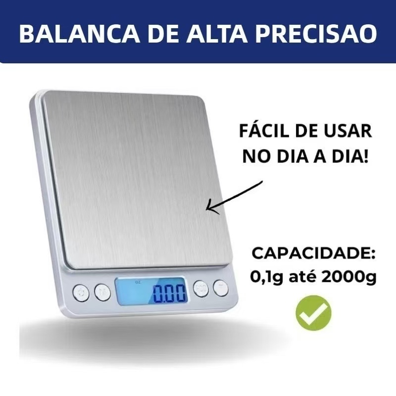 Mini Balança Digital de Precisão ⚖️ Seja Bem-Vindo à Precisão Perfeita! Apresentamos a Mini Balança Digital ideal para medições precisas em casa, na cozinha ou no trabalho. Com design compacto e alta tecnologia, oferecemos exatidão de 0,1g para suas necessidades diárias. ✨ Mini Balança Digital 0,1g Solução profissional para pesagens precisas: ✔ Alta Precisão - Medição exata até 0,1 grama ✔ Ampla Capacidade - Suporta até 2kg (2000g) ✔ Design Compacto - Leve e portátil (cabe em qualquer lugar) ✔ Display LCD Claro - Facilidade de leitura 🍳 Quando Usar? Cozinha Profissional - Medição exata de ingredientes Dietas e Receitas - Controle preciso de porções Trabalhos Artesanais - Pesagem de materiais Farmácia Caseira - Dosagem de suplementos Escritório - Pesar pequenos pacotes Especificações Técnicas: Precisão: 0,1g Capacidade máxima: 2000g Alimentação: 2x pilhas AAA (não inclusas) Dimensões aproximadas: 12x10x2 cm ✅ Garantia de Qualidade Produto novo e testado Não submergir em líquidos Manter longe de umidade excessiva 💡 Por Que Recomendamos? Esta balança oferece precisão profissional, portabilidade e facilidade de uso por um preço acessível, sendo indispensável para quem valoriza exatidão. 🔍 Medições perfeitas em gramas - precisão que cabe na palma da sua mão!